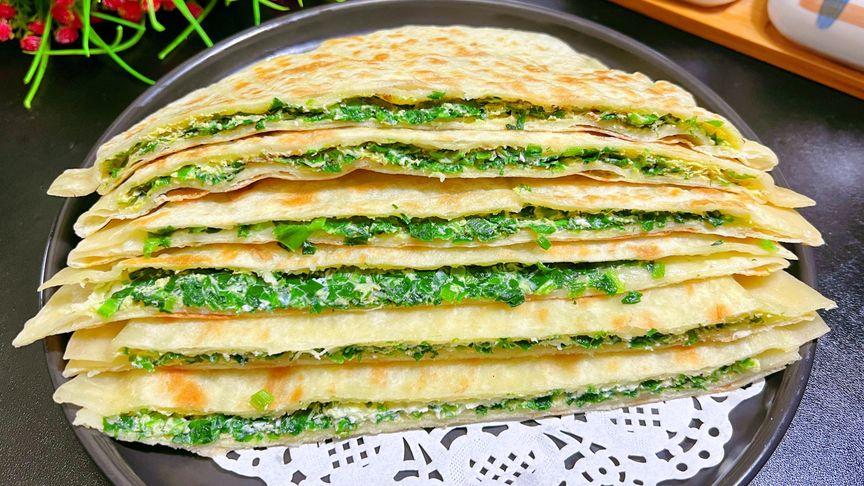 2、電餅鐺預熱刷油,然後再倒入麪糊小火慢烙,烙至底部定型再放入一些韭菜碎攤均勻,然後再打一個雞蛋弄散,烙到定型,然後再摺疊起來,烙至底部焦黃熟透即可。
