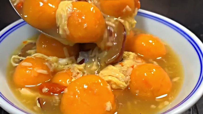 3、鍋中再燒水,放入紅棗、枸杞、紅糖煮入味,再放入煮熟的丸子。淋入澱粉水,接着淋入雞蛋液煮成雞蛋花,紅薯丸子湯就做好了。