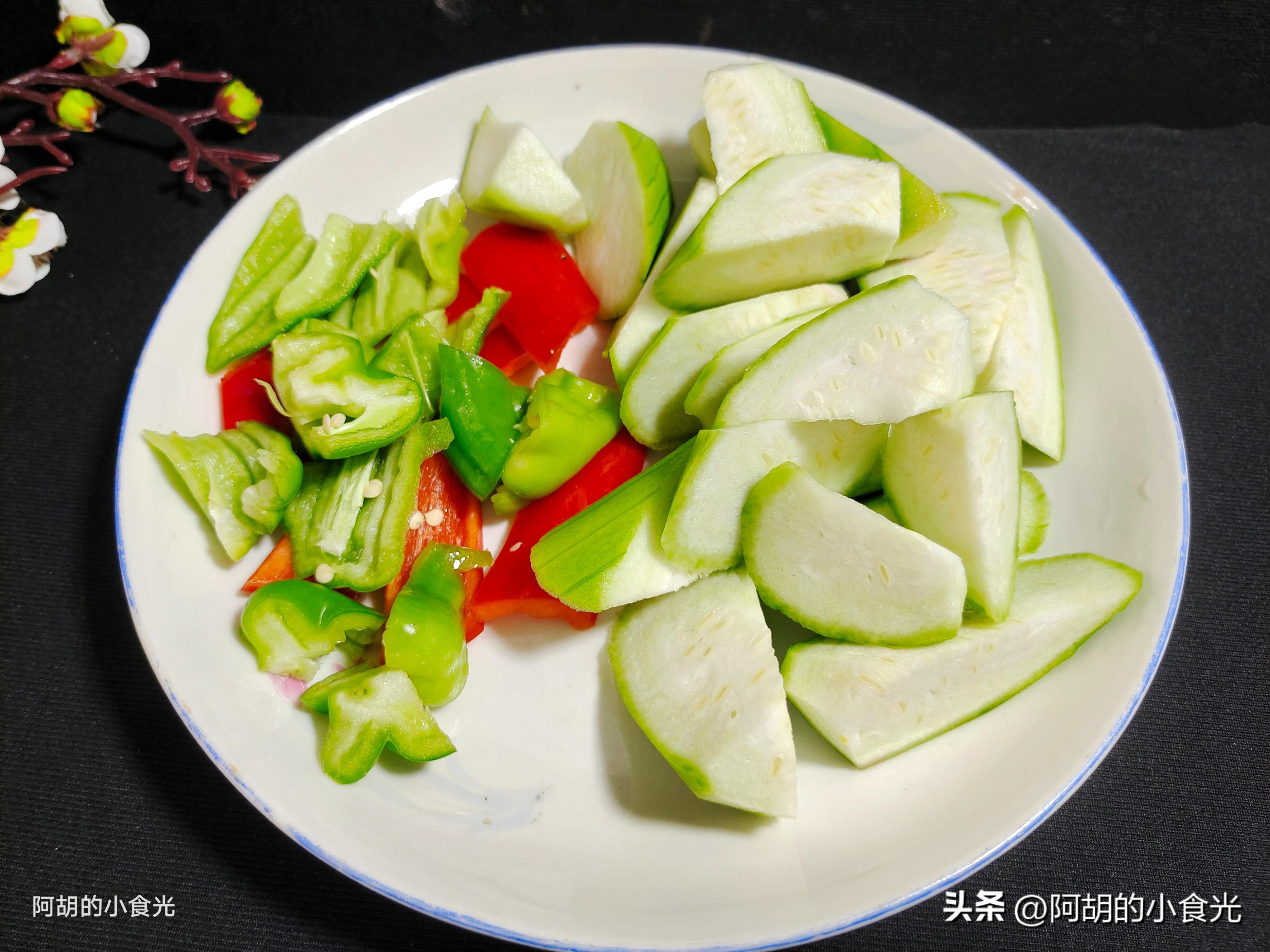 第一步:先來準備蔬菜部分,絲瓜一根削去外皮再直接切成滾刀塊備用,再準備青紅椒各半個切成塊備用,一個西紅柿切塊(圖中未拍到)待用。此處絲瓜切開後容易變色,可以將其投入涼水中浸泡,並淋入一些白醋攪拌均勻,可以延緩其變色的速度。