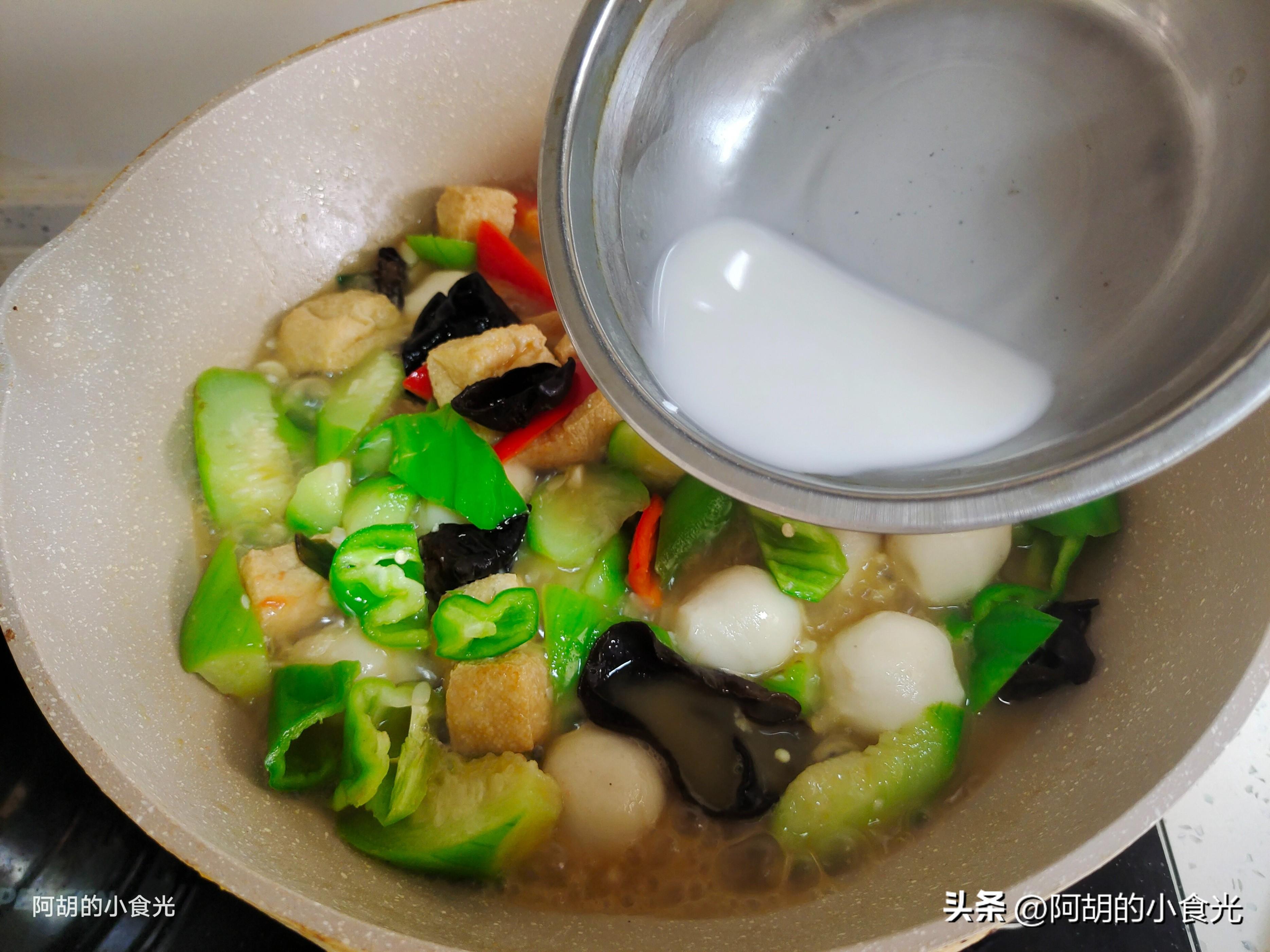第六步:取出最後剩下的青紅椒塊倒入鍋中,簡單翻炒一下,激發出青紅椒的香味。最後用涼水稀釋一些幹澱粉成澱粉水淋入鍋中,同時用勺子攪動食材,讓湯汁變得濃稠就可以關火出鍋了。簡單易做的一道燉菜,食材豐富,滋味鮮美,營養豐富,妥妥的下飯好菜,天熱不想炒菜的時候不妨試一試這個做法。
