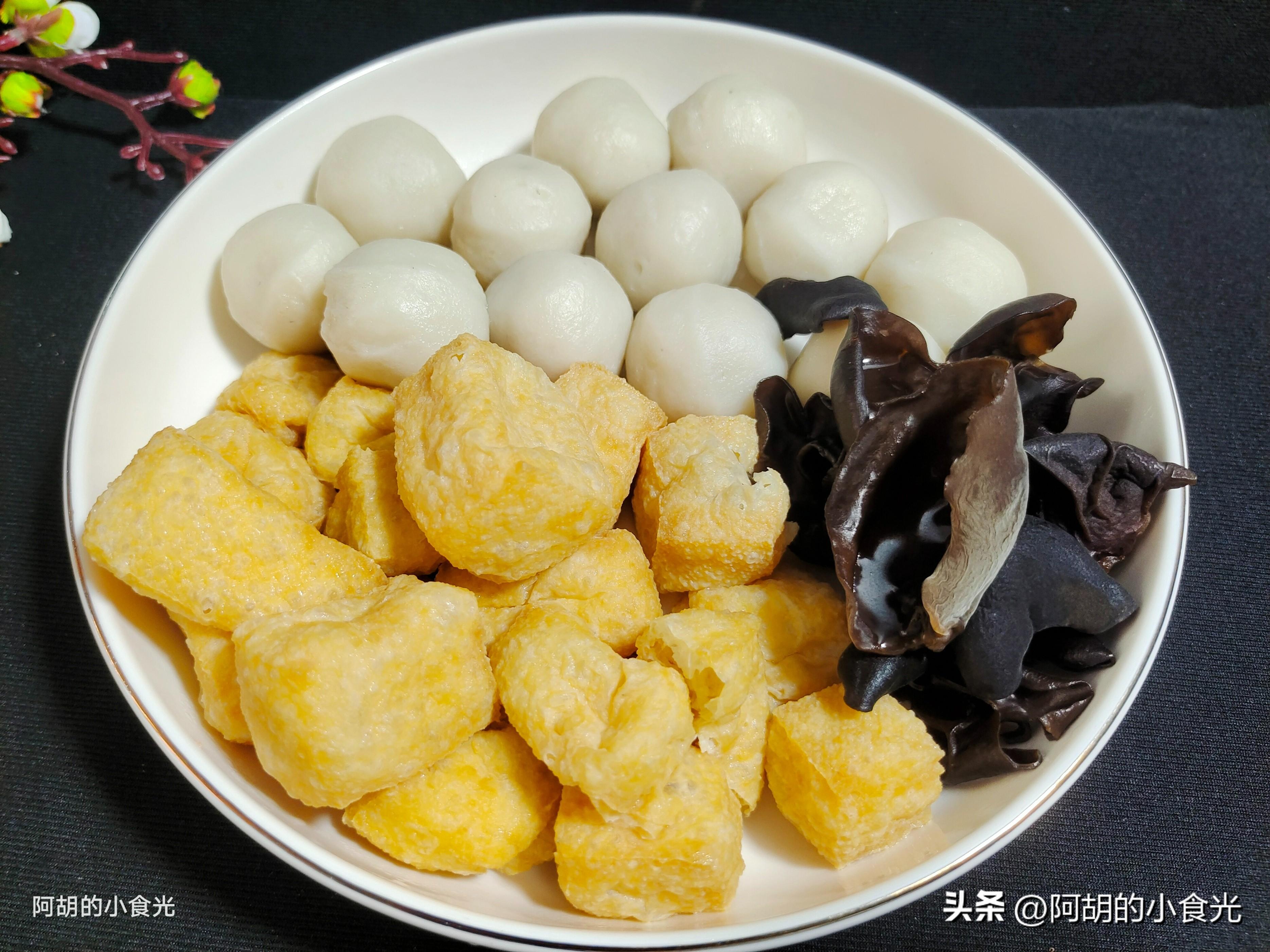 第二步:其餘的食材有魚丸十個左右,魚丸在超市的冷凍櫃中都可以買得到,也可以到各網點中搜尋更優質的魚丸。還有適量的油豆腐,這個油豆腐最好用熱水焯燙一下,撈出後再用涼水沖洗乾淨,幫助去除一些油脂。還有少許的幹木耳用溫水泡發備用。