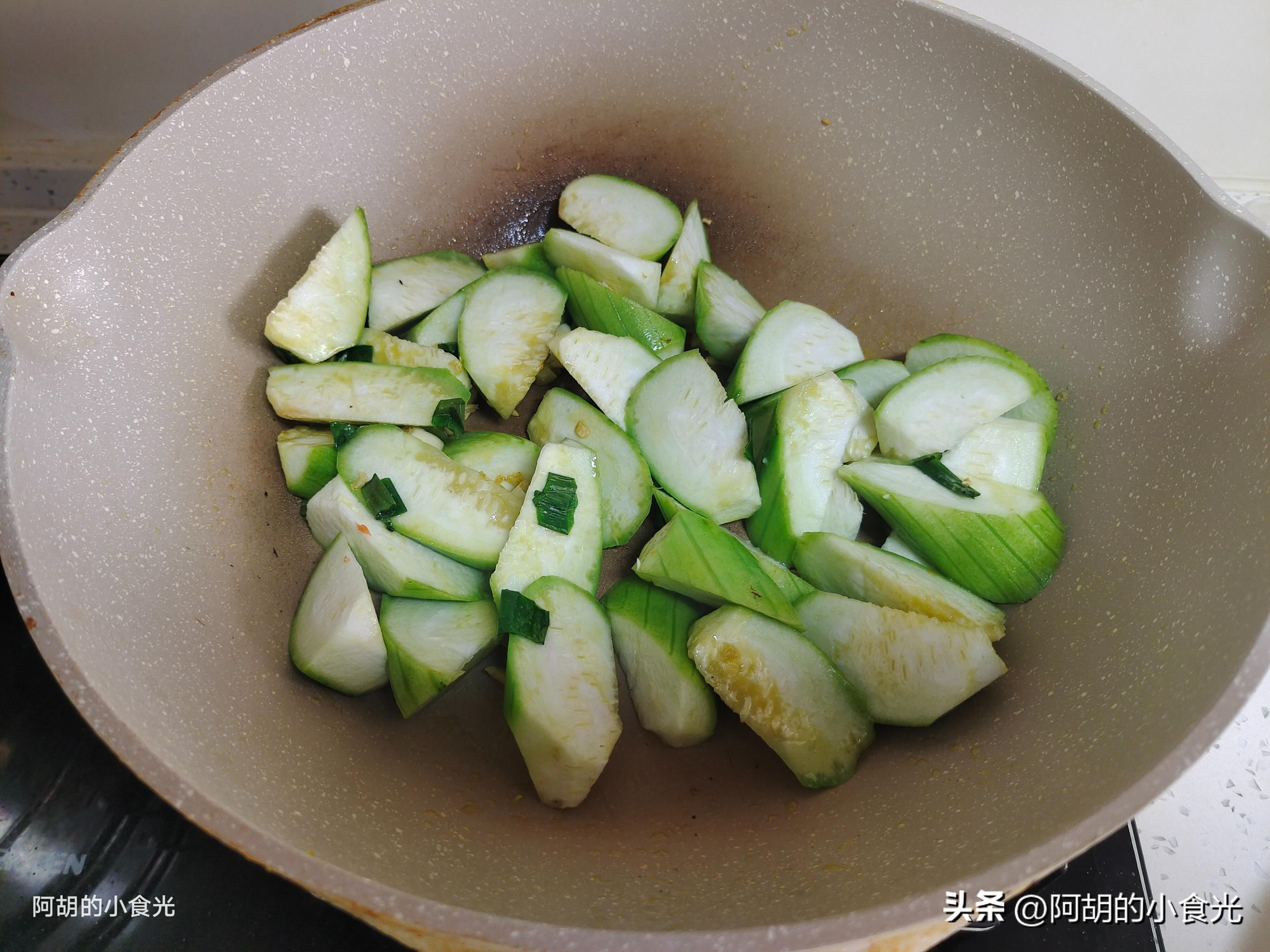 第三步:所有食材準備好以後就可以開火烹飪了。先把鍋燒乾,淋入一些菜籽油燒熱,再撒入一些小料蔥蒜末炒出香味。接着先把絲瓜下鍋簡單翻炒翻炒。