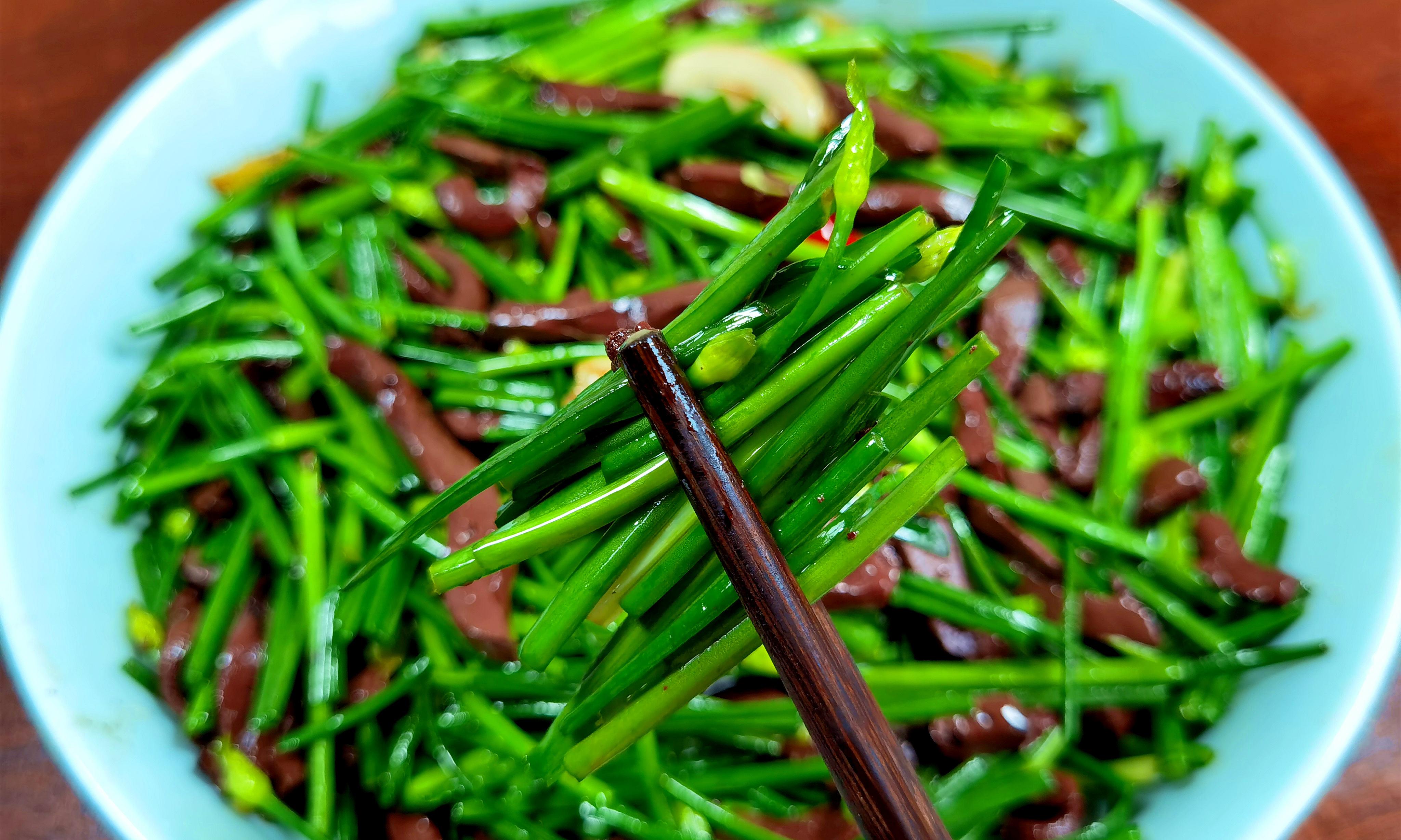 韭菜薹辛溫,能溫腎助陽、行氣活血、健胃提神;豬血性平,富含鐵質和優質蛋白,有解毒清腸、補血養顏的功效。這道菜一溫一平,既能生髮下焦陽氣,又能清理腸道垃圾,特別適合感覺三伏天肚子脹脹的、消化不太給力的時候喫。注意韭菜薹要大火快炒,保持脆嫩口感,豬血嫩滑纔好喫。體質特別燥熱的朋友,韭菜薹量可以酌情減少。