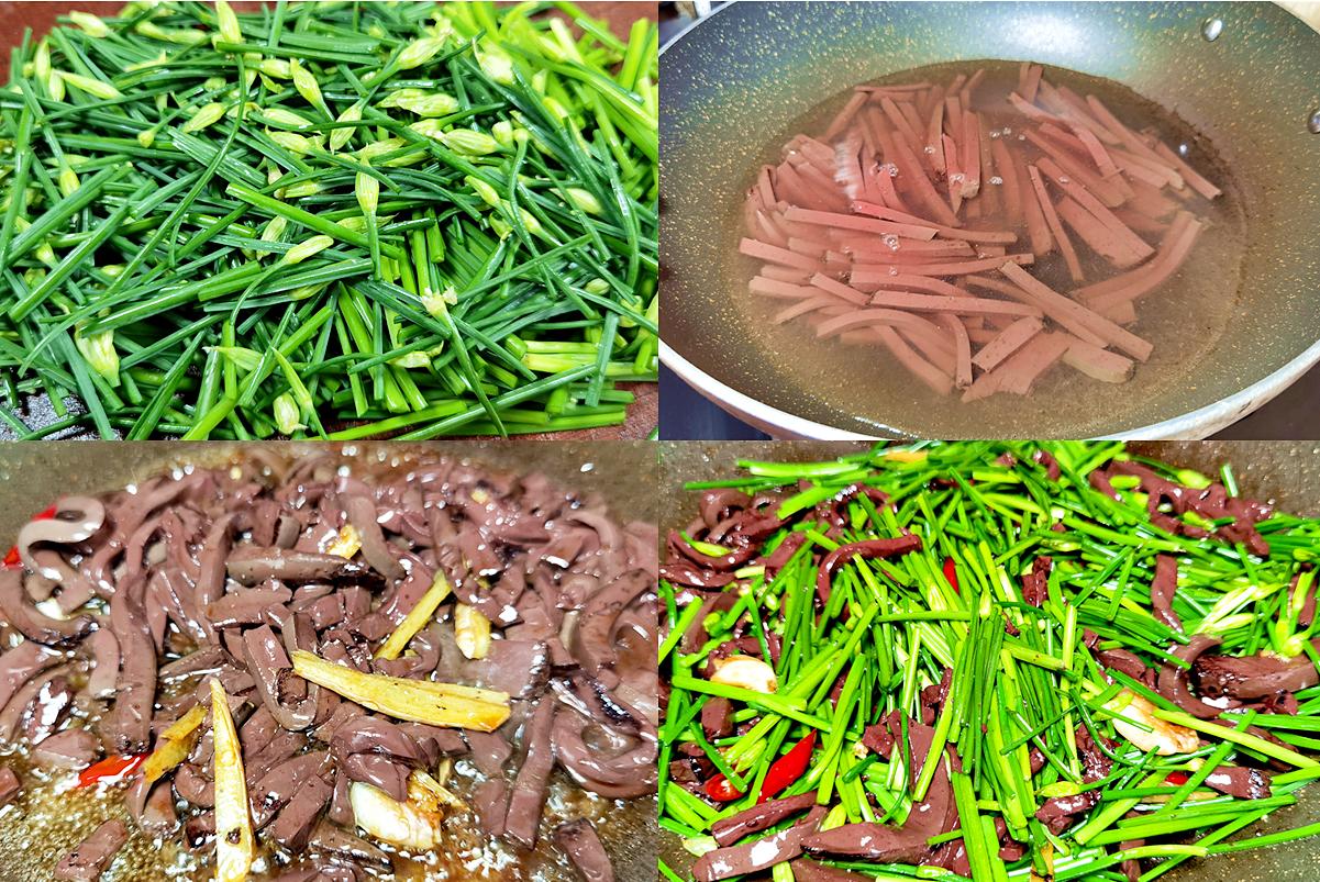 1. 韭菜薹掐掉尾部老硬的部分,洗淨,切成寸段。豬血切成大小適中的方塊或厚片。燒一鍋開水,水裏加點料酒和幾片姜,把豬血塊放進去焯燙1分鐘左右(去腥定型),撈出瀝乾。準備點薑末、蒜末,喜歡喫辣的可以切點小米辣。