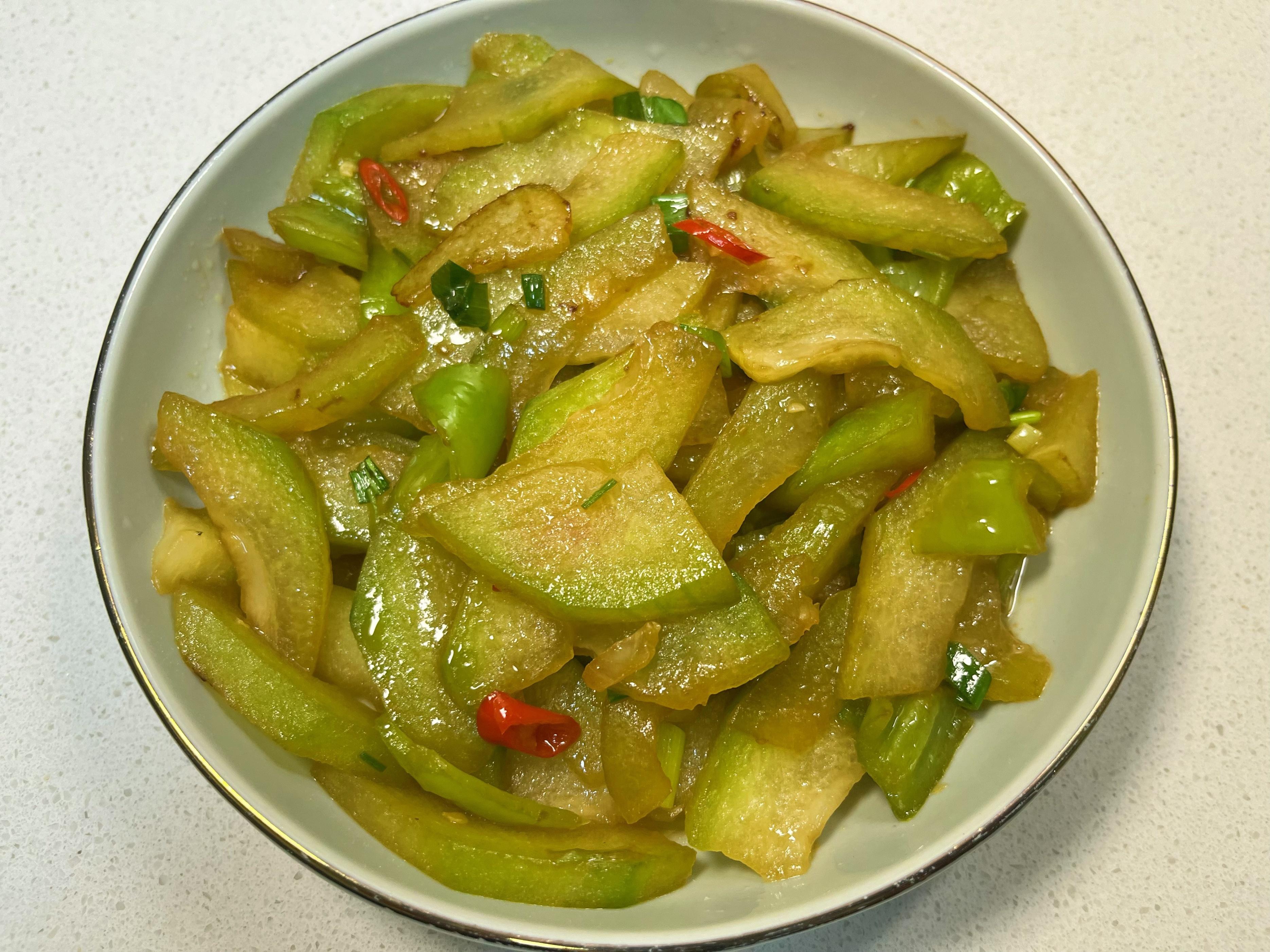 4. 沿鍋邊烹入少許熱水,加蓋略燜至冬瓜軟熟,調入鹽、少許生抽,炒勻收汁。