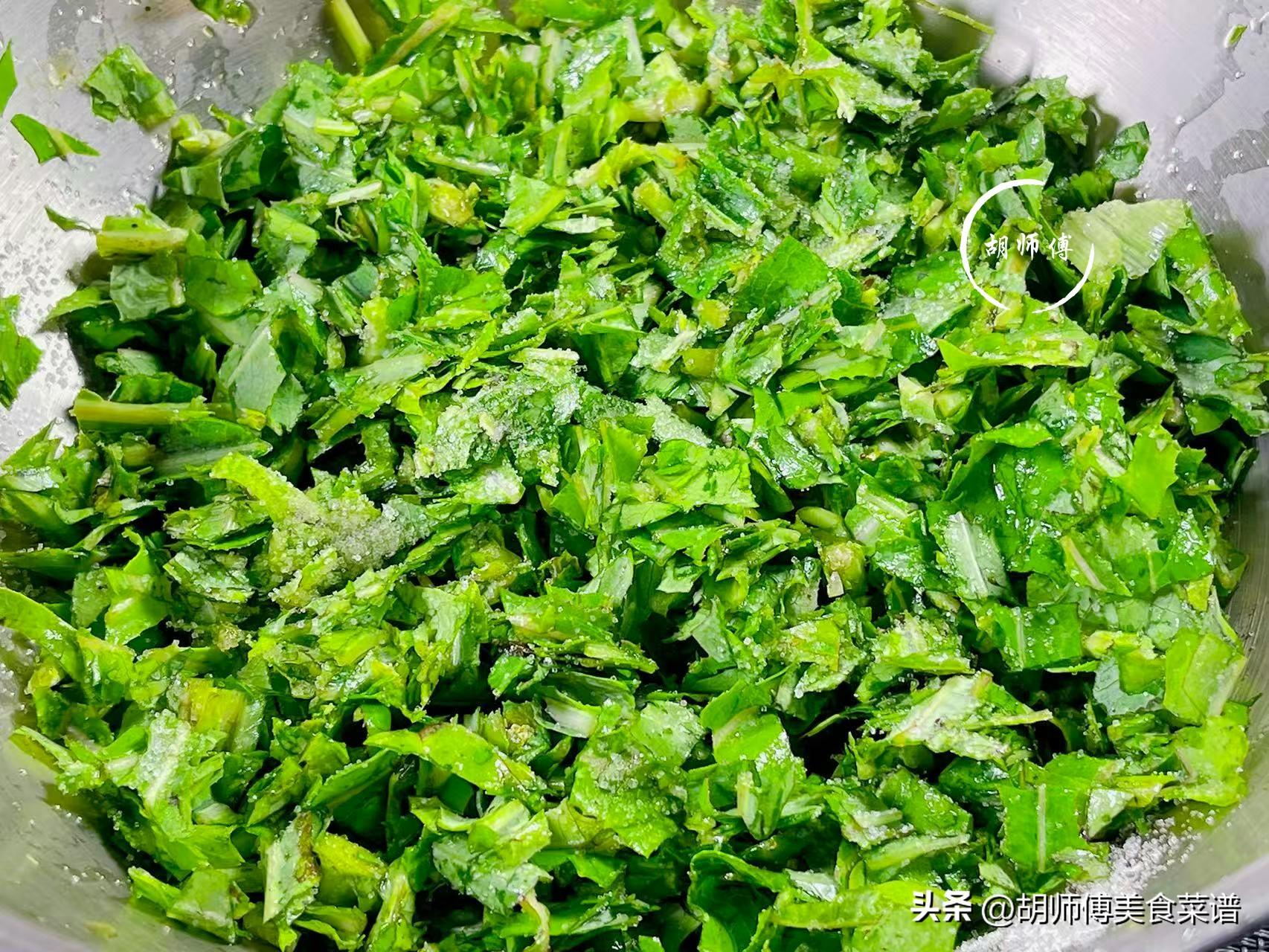 第二步:將洗淨瀝乾的曲麻菜切成碎末後,然後將一把食鹽放入曲麻菜中,將它醃製10分鐘後,再將裏面的水全部都擠出來,接着再用自來水將曲麻菜裏的食鹽全部都沖洗掉。