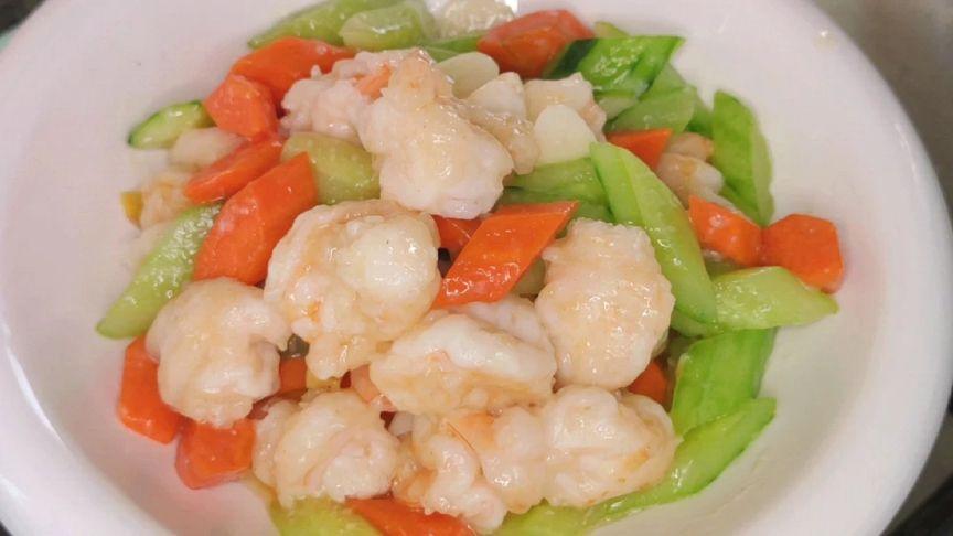 3、鍋中放點食用油,先放入蔥花,黃瓜,胡蘿蔔,蝦仁翻炒幾下,再放點幾白糖,食鹽,再放點清水。把調料化開之後用點薄芡。把它拌勻,就可以出鍋了。