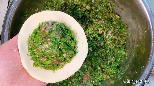 這時候,把之前用油封好的茴香碎,一股腦兒倒進肉餡盆裏,加鹽、食用油攪拌均勻,看着這盆綠白相間、香氣撲鼻的餡料,成就感爆棚!