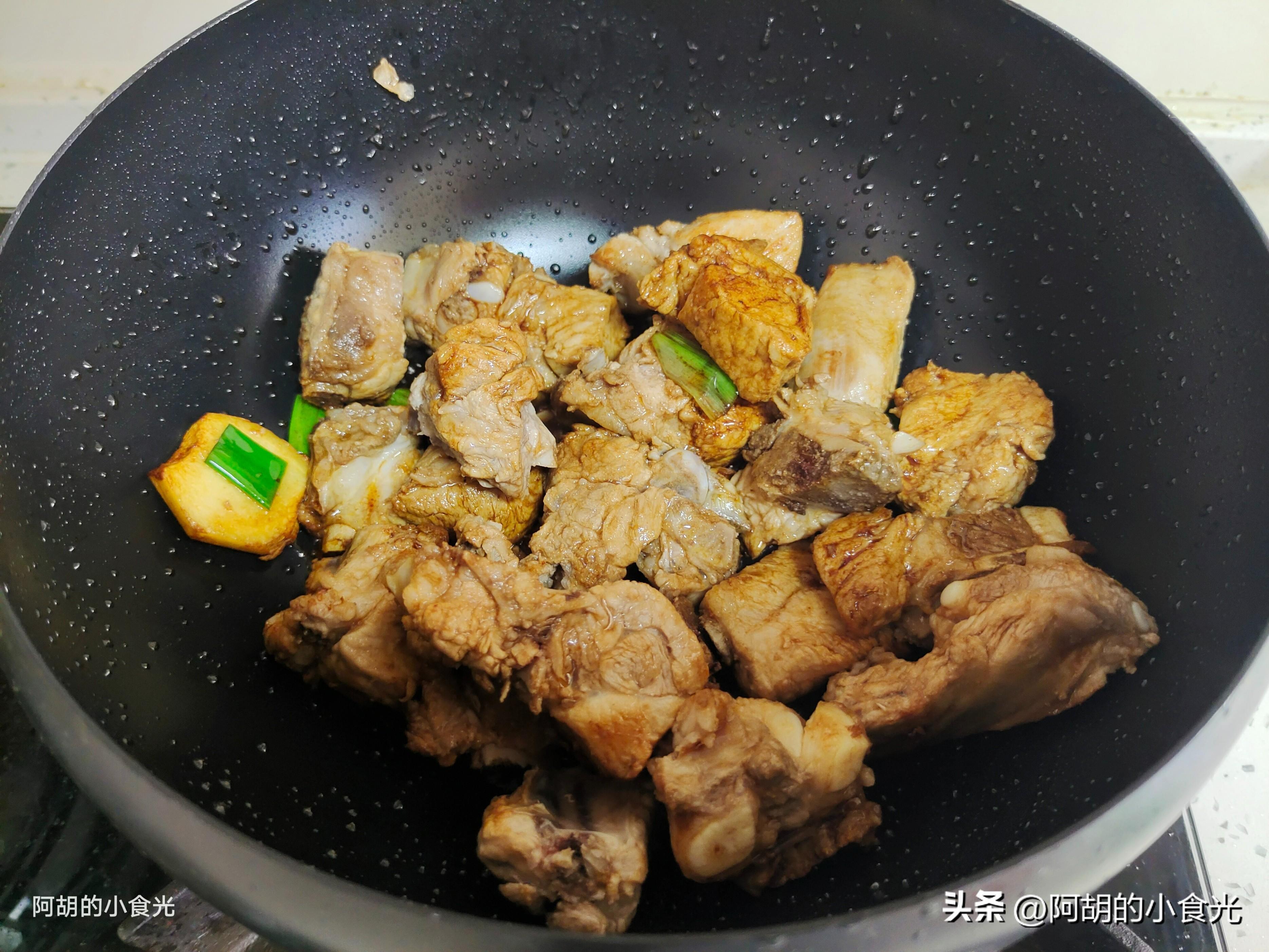 第四步:所有食材備好後就可以開火烹飪了。鍋燒乾後淋入一些食用油燒熱,直接將焯水後的排骨下鍋炒一炒,煸炒至排骨邊角有些焦黃的時候加入蔥薑蒜和八角炒出香味,接着再淋入一些生抽和老抽翻炒至上色。