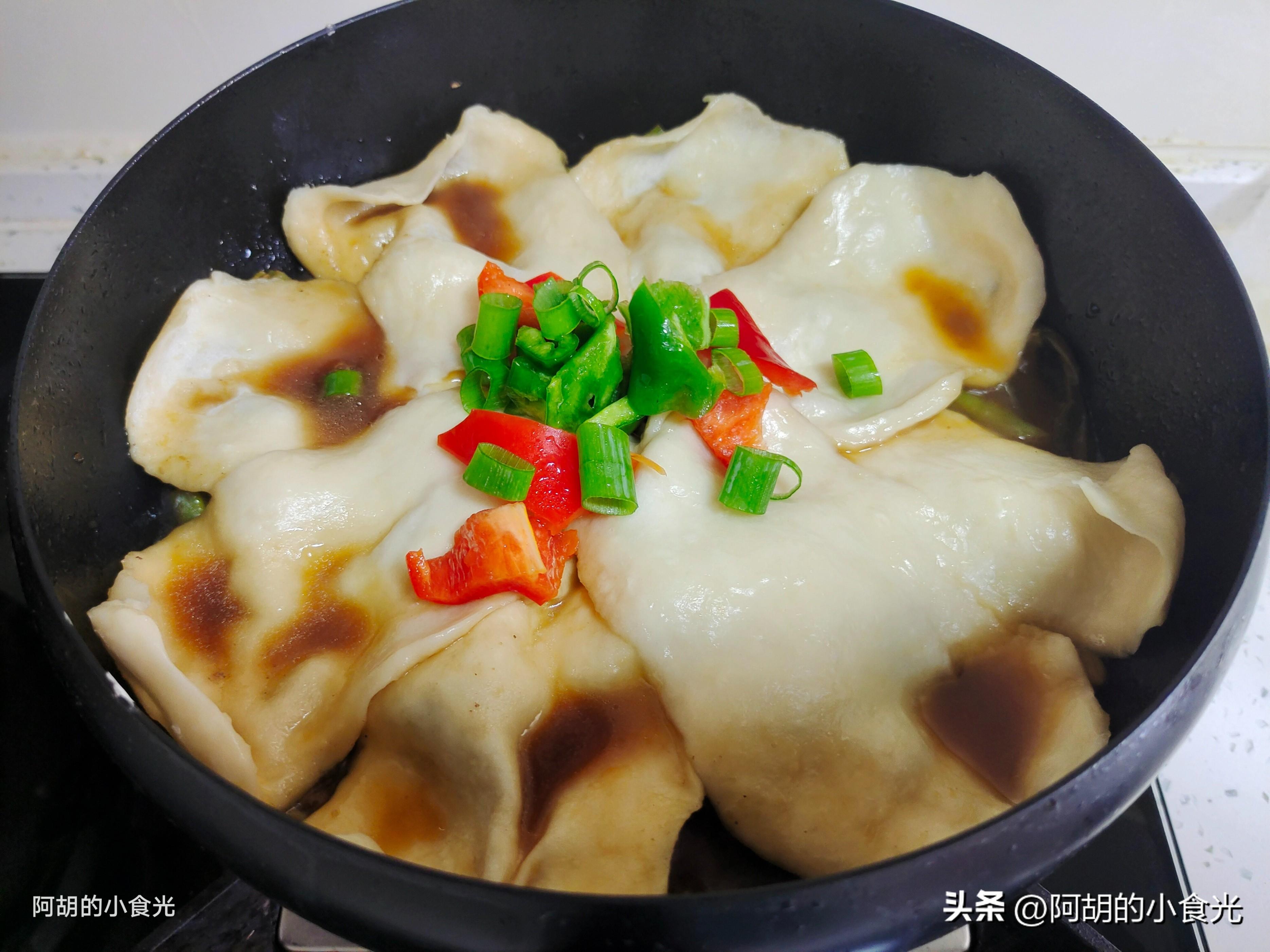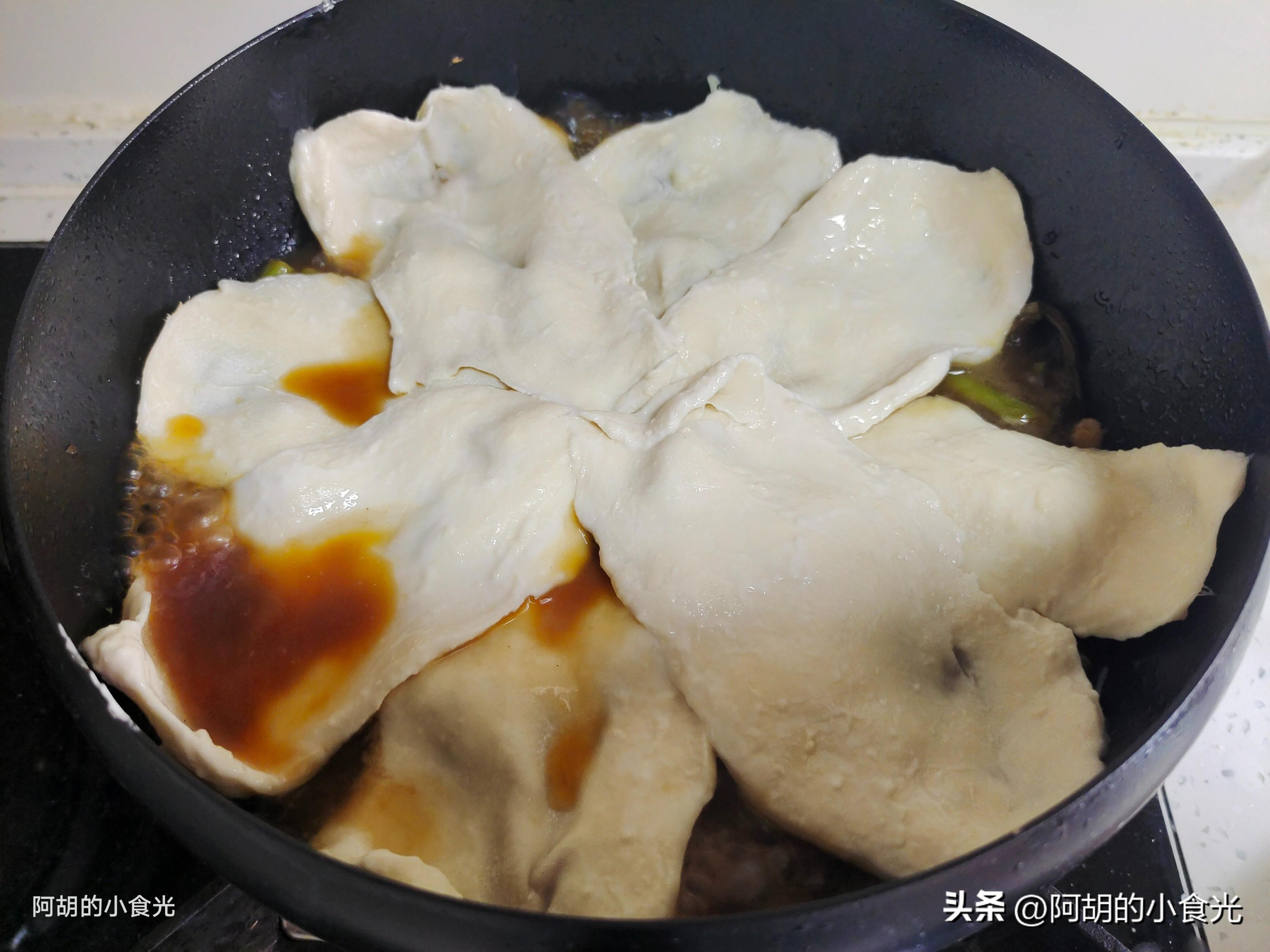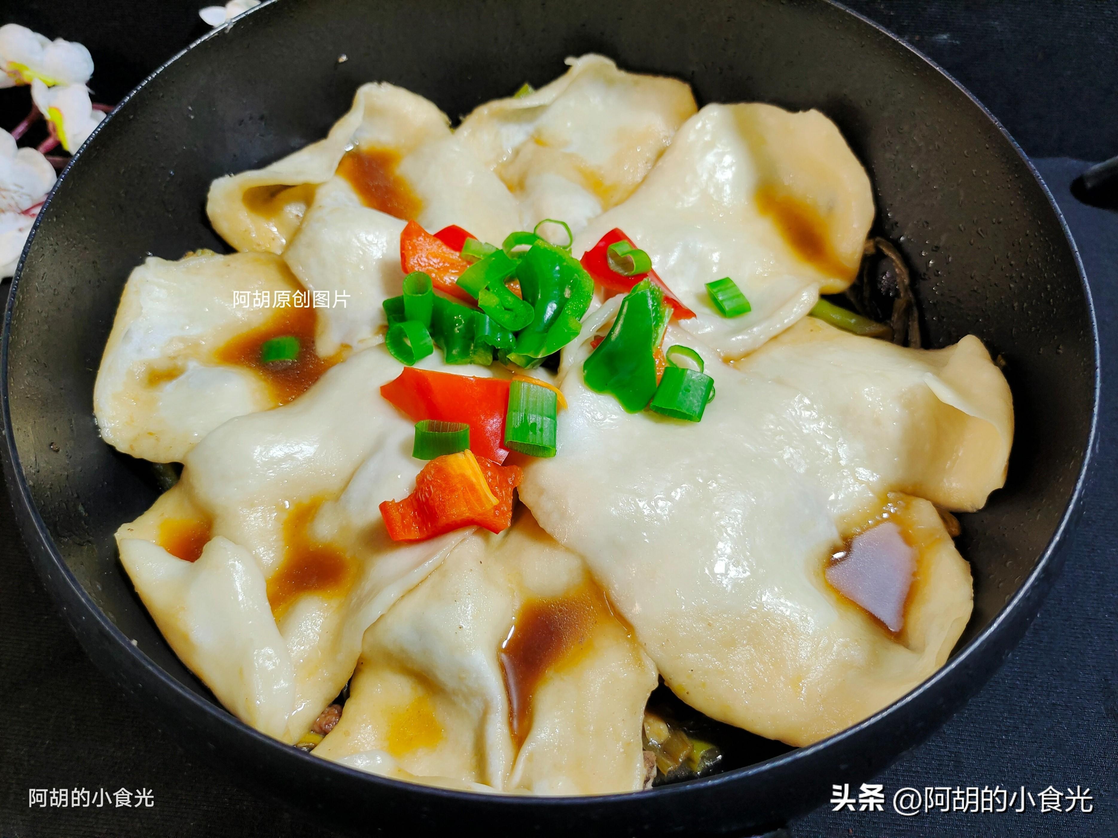 第七步:依次將所有面劑子全部製成麪皮下鍋,而後加蓋繼續保持中小火燜煮十分鐘左右,保證所有面皮全部熟透,出鍋後先把鍋貼麪皮取出,排骨中再加入一些青紅椒和蔥花翻拌均勻就可以出鍋裝盤了。有菜有肉有主食,鍋貼被湯汁浸潤的有滋有味,排骨軟爛又入味,配菜也是滋味豐富,好喫又過癮,值得各位試一試。