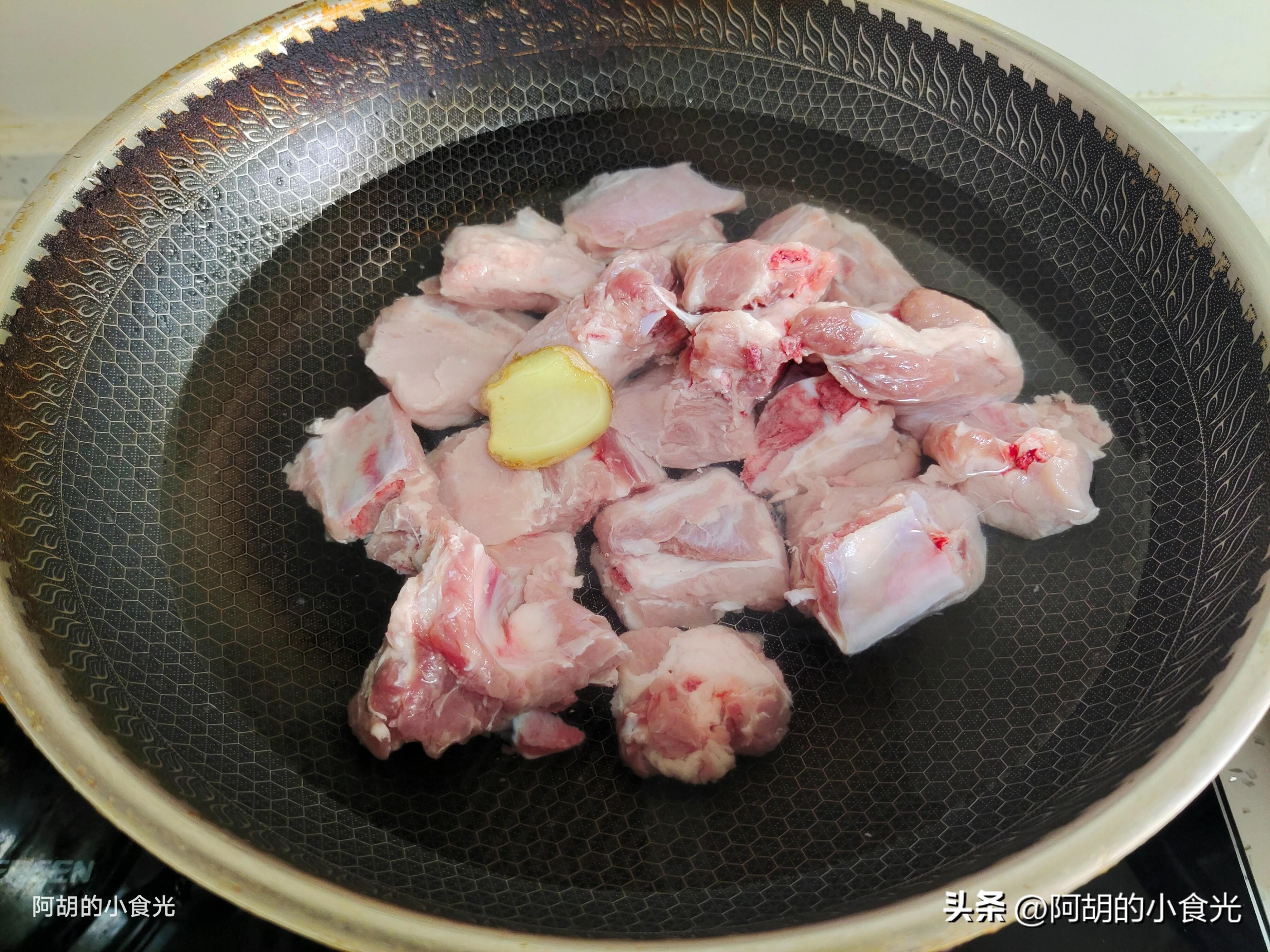 第一步:準備排骨三根,剁成塊後加入涼水浸泡一個小時,而後涼水下鍋,加入一片姜開大火焯水5分鐘,過程中水面會有一些血沫漂浮而出,儘量將其打撈乾淨,而後把排骨撈出,用溫水沖洗乾淨後備用。