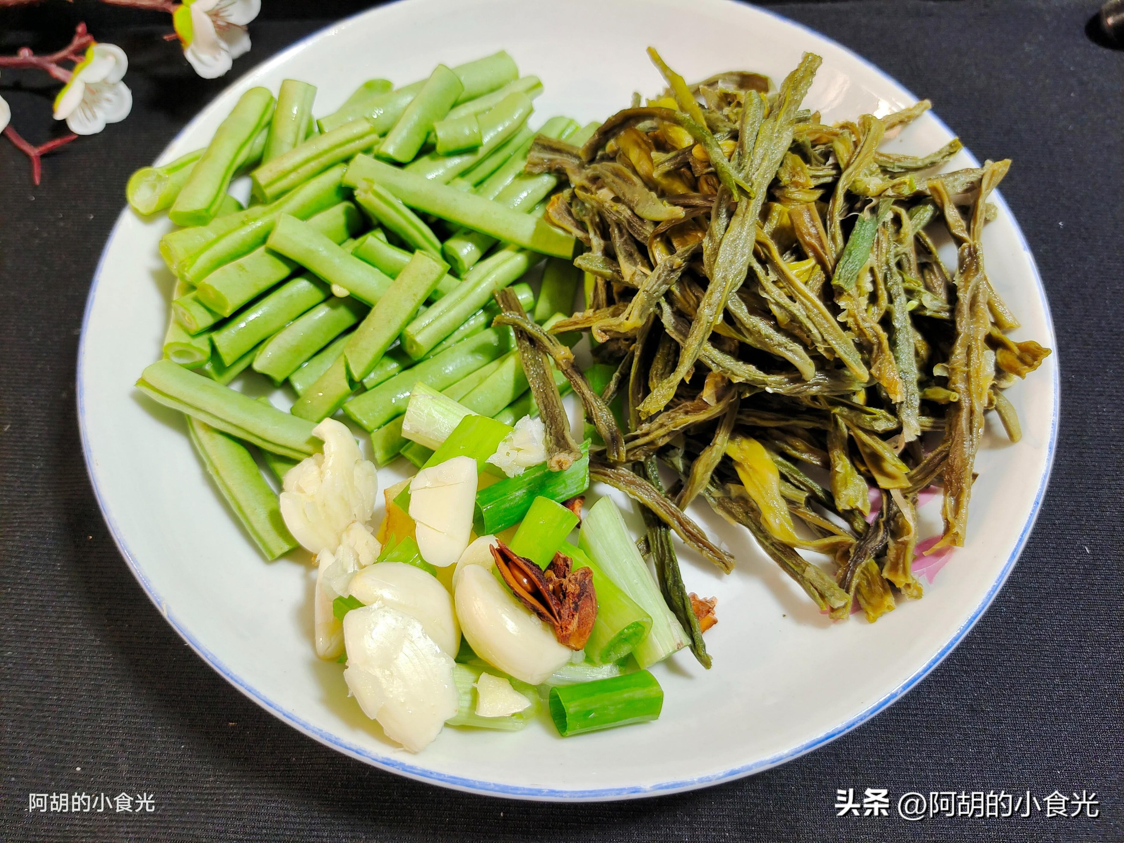 第二步:準備的配菜有幹豆角適量,用涼水泡發後擠幹水分,再切成小段待用。我們今天再搭配一些鮮豆角,一把眉豆角洗淨後切成小段待用。而後再準備一些蔥薑蒜作爲小料,一個八角用來提味。喜歡辣味的可以在小料中搭配幾個幹辣椒。