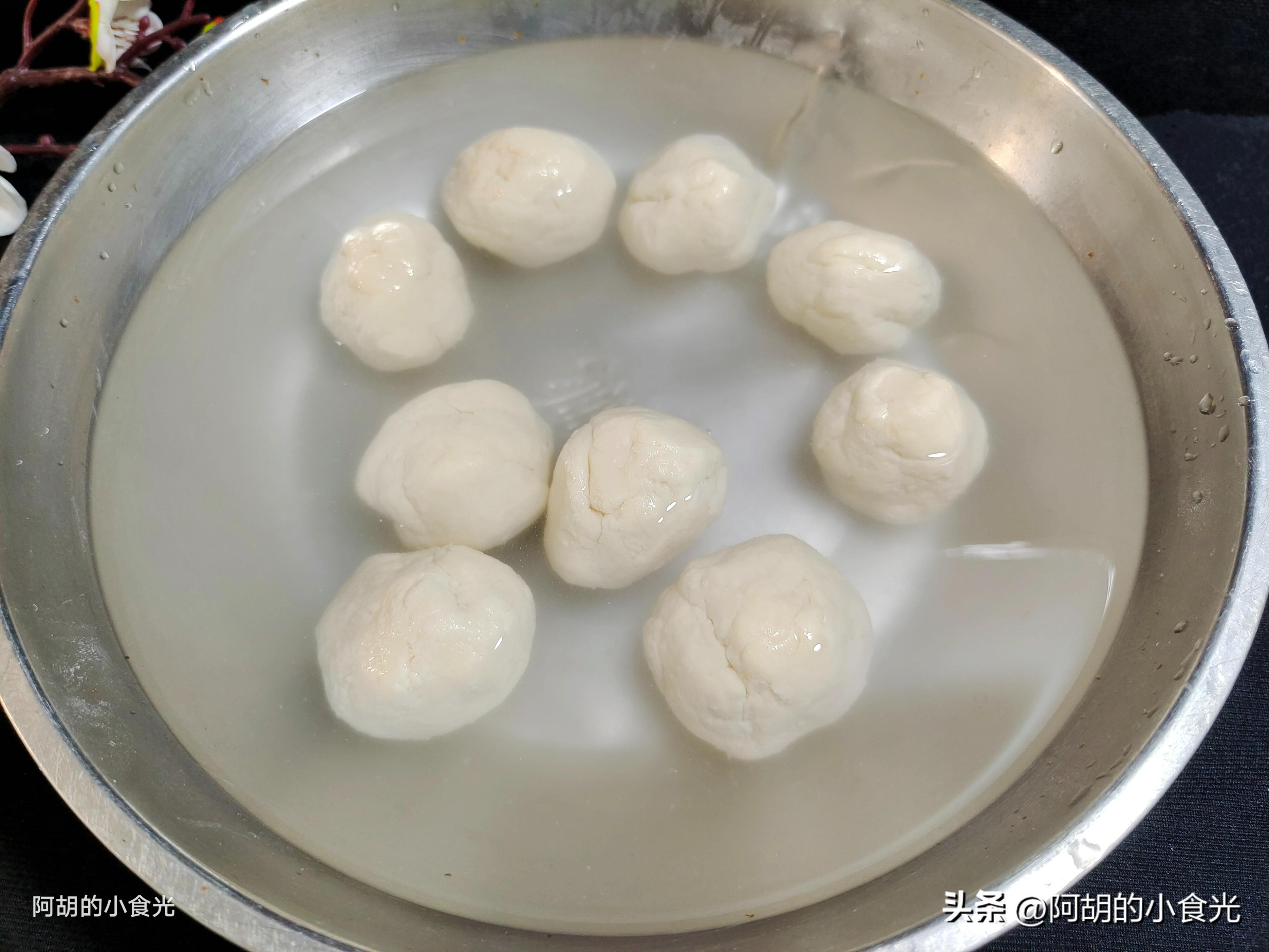 揪開的面劑子最好放入涼水中浸泡鬆弛,這樣下鍋的時候操作比較方便,面劑子又軟又滑,直接用手掌按壓推拉即成一個麪皮,也不會粘手的。不習慣的可以直接用擀麪杖擀開即可。