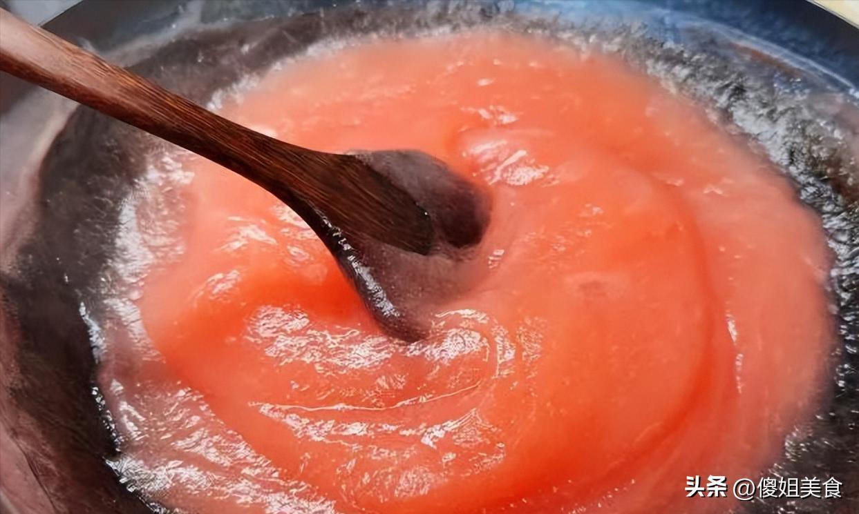3、鍋里加兩大碗清水,放一小勺食用鹼攪開。中火燒到鍋底冒密集小魚眼泡,立刻轉小火!關鍵動作:一手緩緩倒入西紅柿粉漿,一手握鏟子順時針瘋狂攪拌!眼見粉漿變稠、透亮、冒大泡…熬成晶瑩紅瑪瑙膏狀就關火!