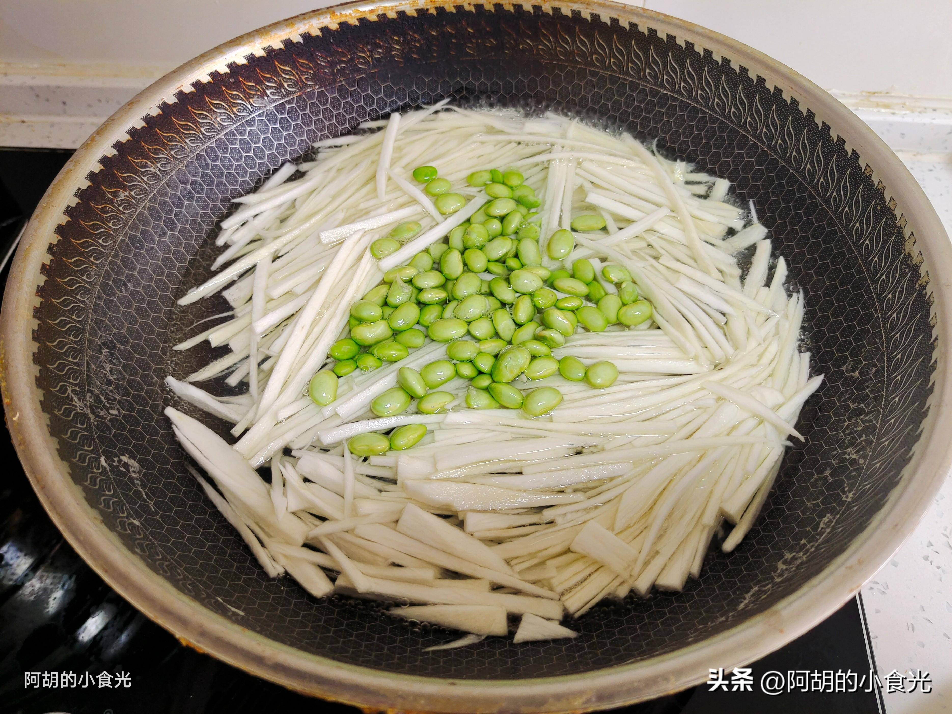 第一步:先準備茭白兩個,剝去外殼後再用削皮刀將茭白肉的表皮再削掉一層,而後先切片再切絲放入碗中待用,順便準備半碗的鮮毛豆仁洗淨待用。因爲茭白含有一些草酸,這裏建議可以把茭白先焯水,大火煮開後十幾秒鐘就可以撈出,順便把鮮毛豆也下鍋煮一煮。撈出後立刻用涼水冷卻,撈出後擠一擠水分鋪放入盤子裏備用。