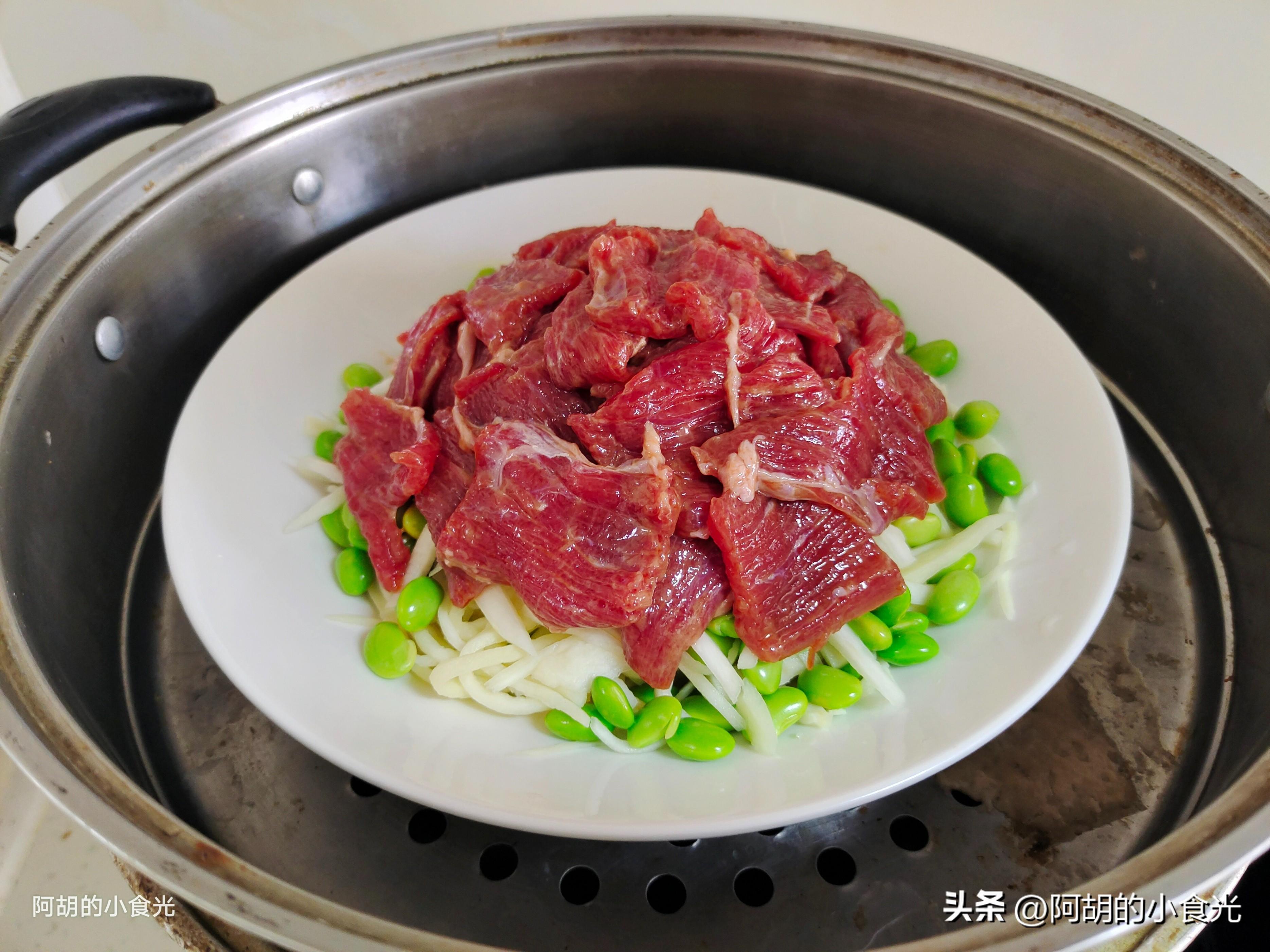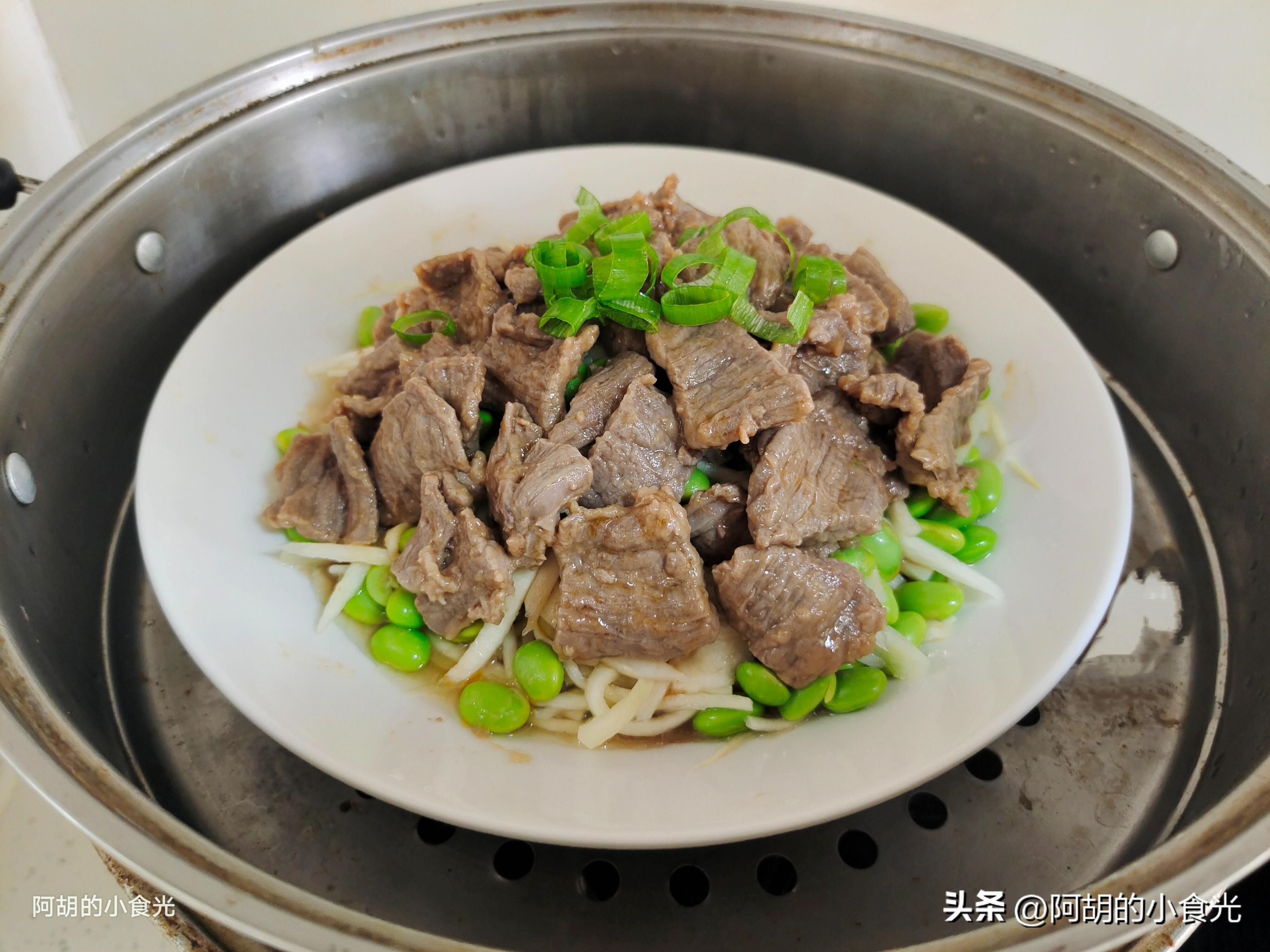 第五步:蒸鍋中添入一些涼水,將茭白牛肉片上鍋,加蓋後開大火開始蒸,觀察鍋內完全上汽後就開始計時,差不多十分鐘左右就差不多了,開蓋撒一些蔥花或者紅椒點綴就可以出鍋開喫了。一道鮮美又營養的蒸菜,牛肉鮮嫩、還有濃濃蔥油味的茭白和毛豆,葷素搭配妥妥的下飯好菜,感興趣的一定要試一試這個做法。