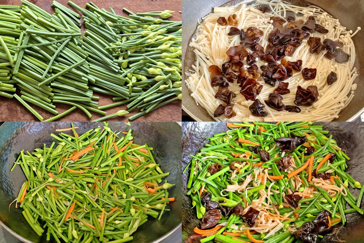 1. 韭菜薹洗淨切段,胡蘿蔔切細絲或薄片,金針菇去根洗淨撕開,幹木耳泡發洗淨撕小朵。