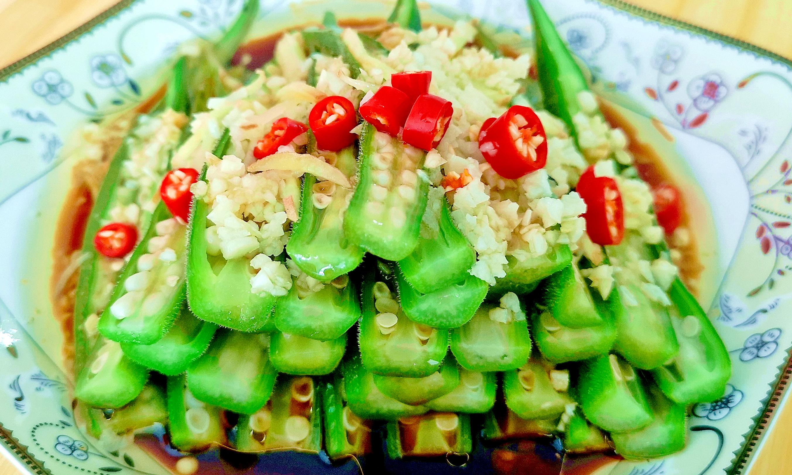 焯水:燒一鍋水,加點鹽和幾滴油(讓顏色更鮮亮),水開下秋葵,燙個2分鐘左右,變翠綠變軟就趕緊撈起,泡下涼水(口感更脆)。