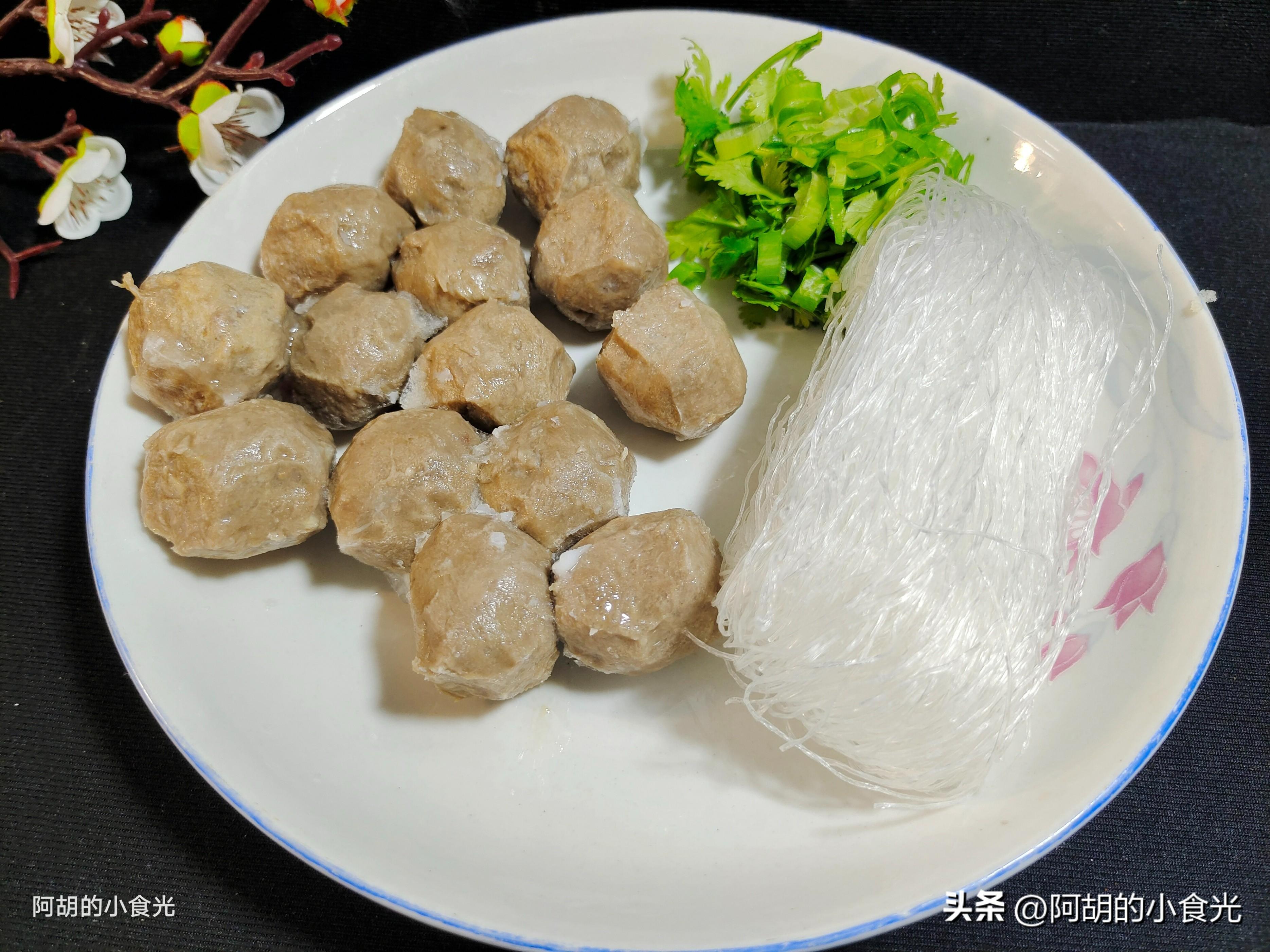 第一步:牛肉丸是冷凍的,稍稍解凍後即可倒出備用,注意挑選牛肉丸的時候要看好配料,儘量只有牛肉和澱粉的組合最好,避免挑選到“牛肉風味”的肉丸。順便準備一塊龍口粉絲,粉絲使用之前可以用溫水泡軟,再來適量的香菜碎和蔥花待用。