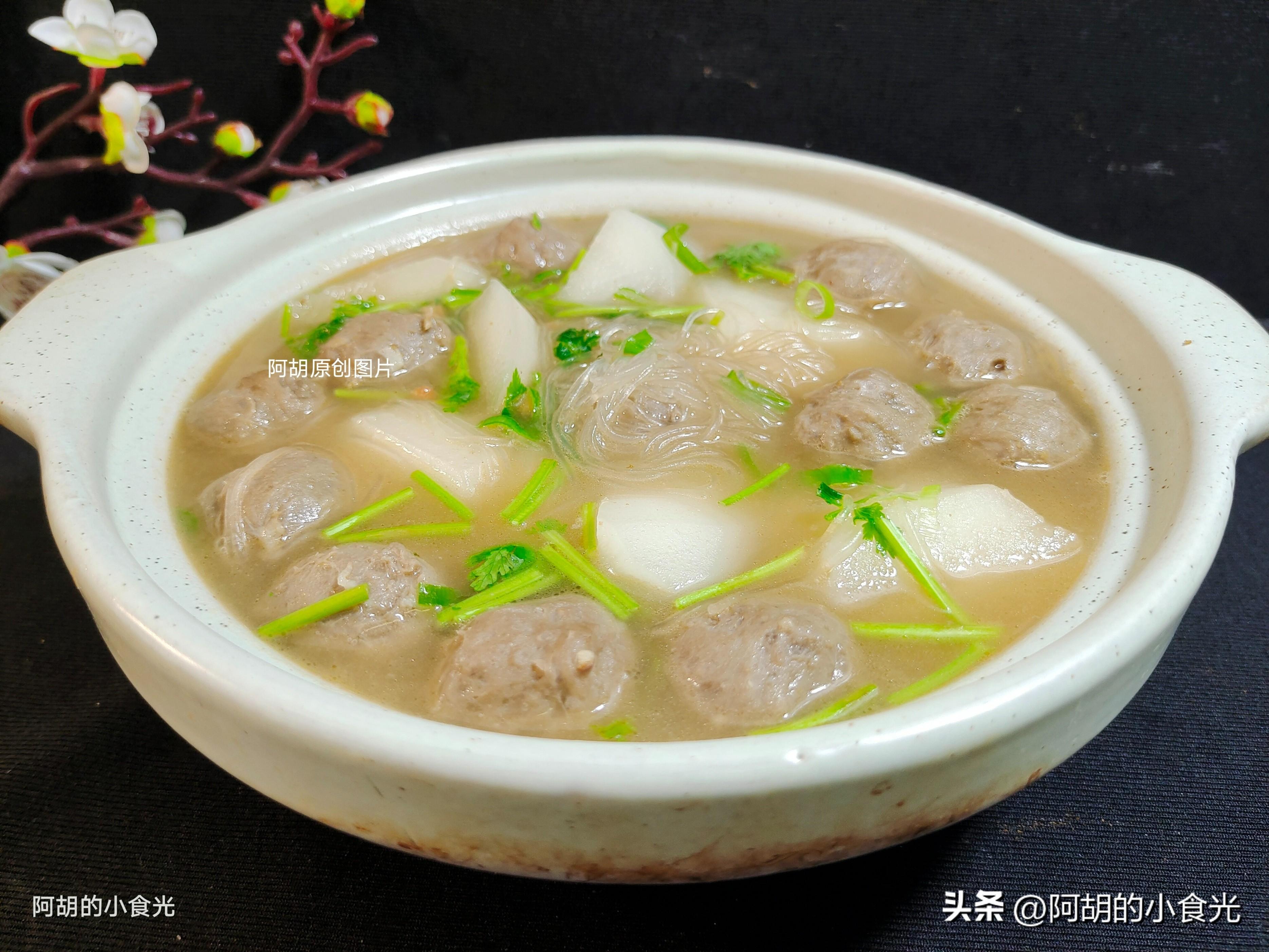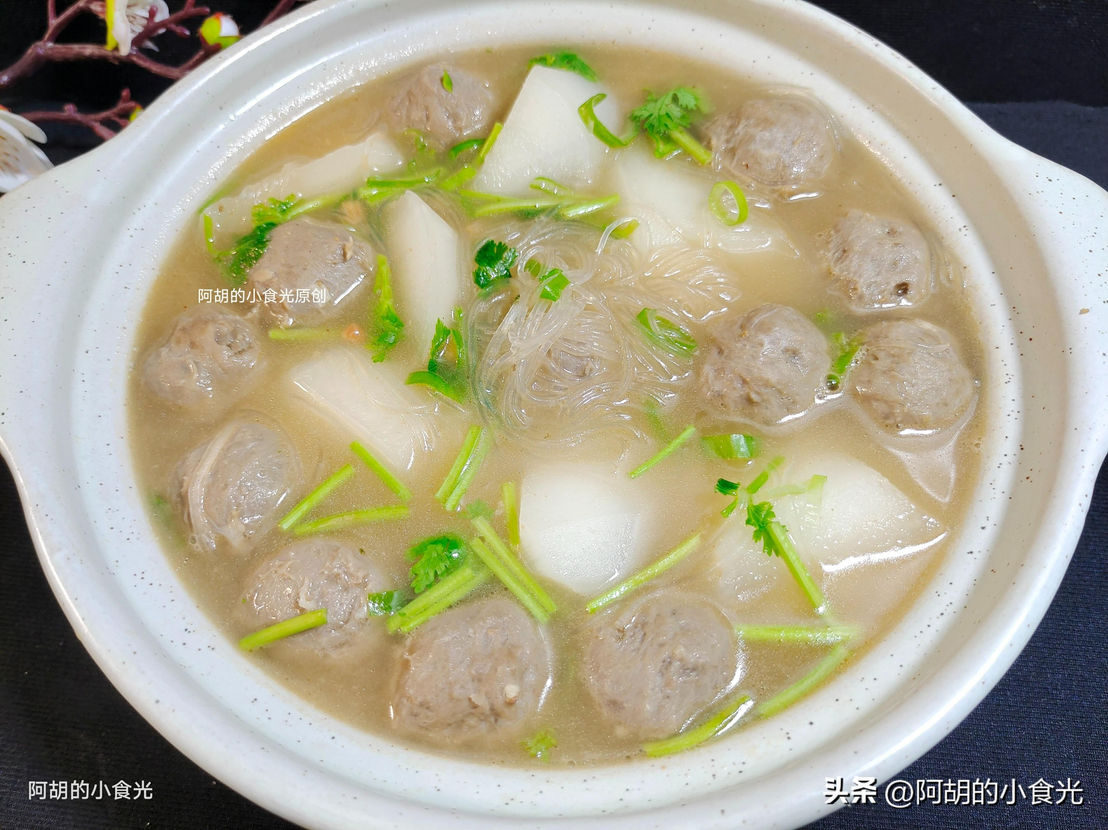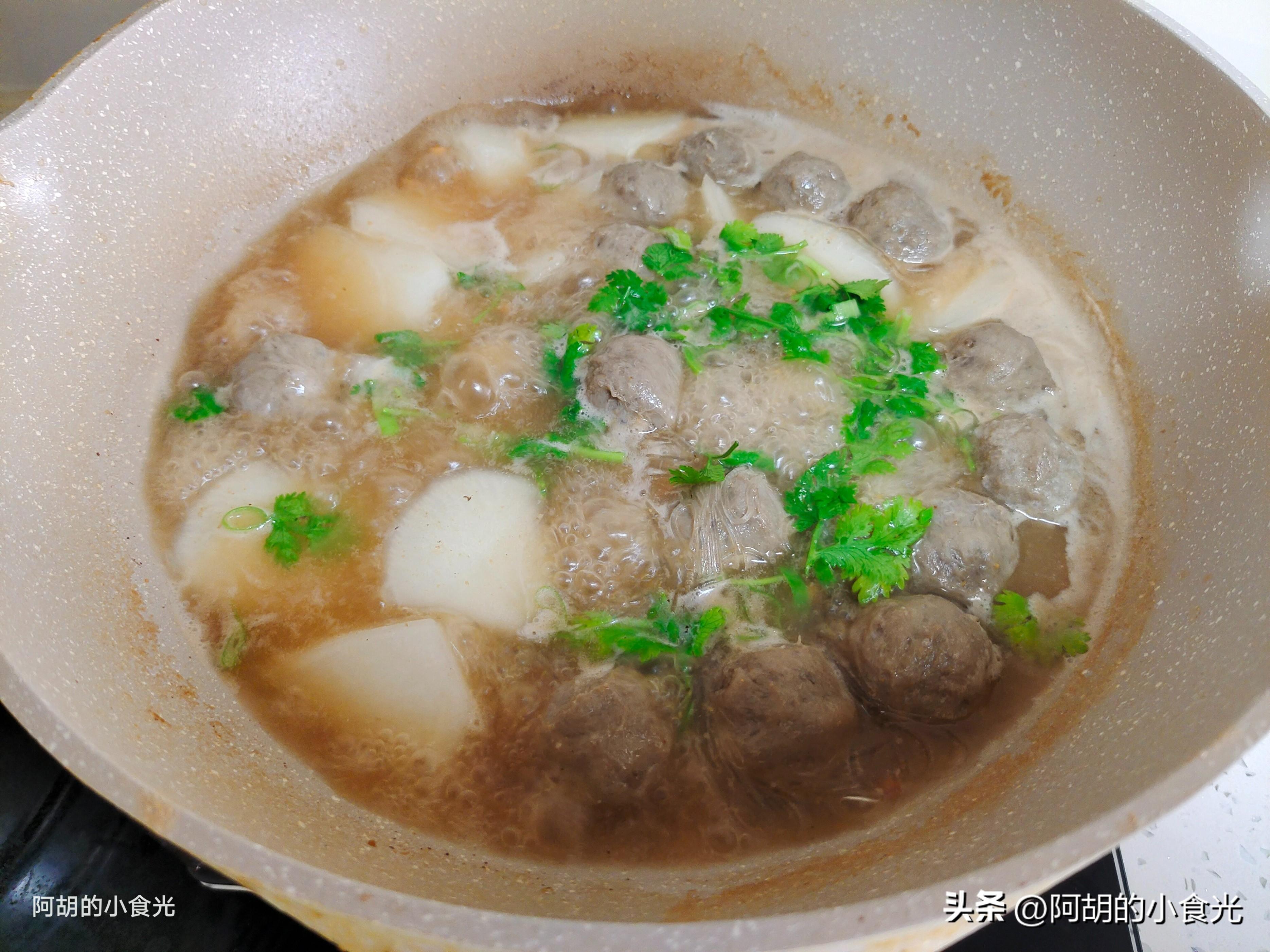 第六步:最後取出粉絲加入鍋中,攪拌一下再煮個兩分鐘左右,撒入一些蔥花和香菜碎後就可以出鍋裝盤了。好做又好味的一道湯,湯汁有濃濃的醬汁味,濃郁又開胃,牛肉丸脆嫩鮮香,蘿蔔和粉絲的味道也恰到好處,妥妥的夏季開胃好湯,值得各位試一試。