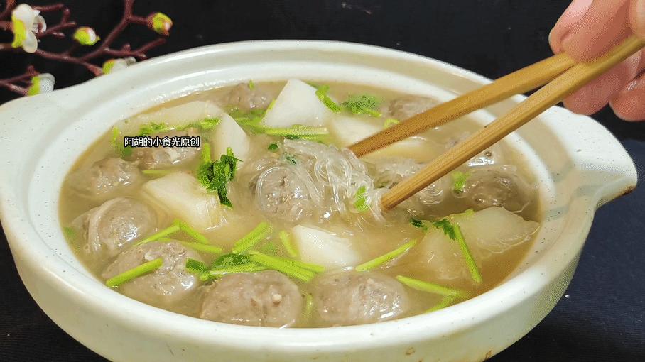 這道湯的主要食材就3樣,但營養搭配很合適,有牛肉丸、蘿蔔和粉絲,牛肉是肉中驕子,是優質蛋白質的來源,蘿蔔是蔬菜,那粉絲就是碳水了。最關鍵的是這道湯的調味,由兩種“醬料”完成,一塊下鍋煮一煮就成。