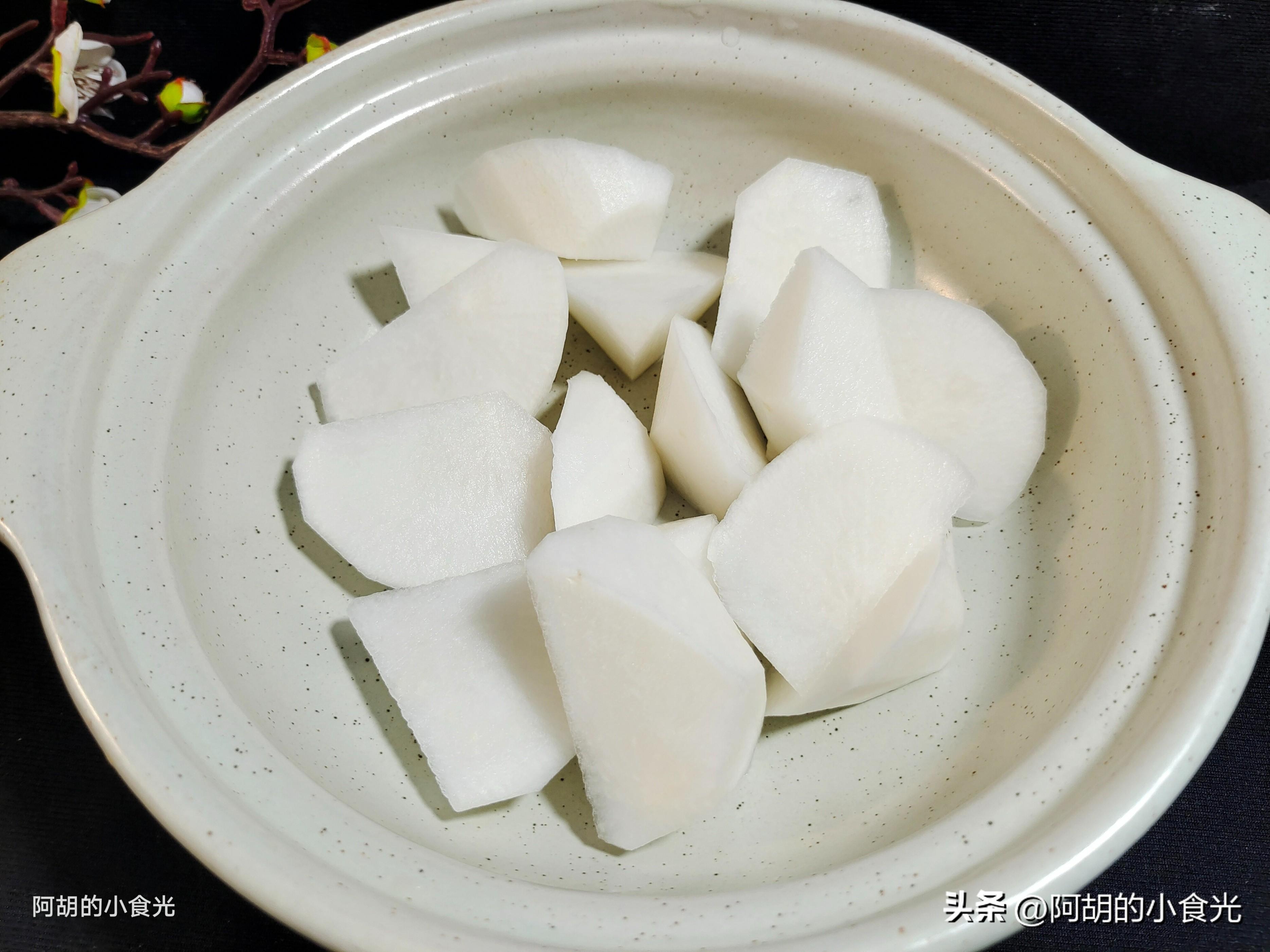 第二步:準備一個白蘿蔔,削掉外皮後直接切成滾刀塊放入碗中待用。很多人不太喜歡蘿蔔的“臭味”,這裏建議可以用開水焯燙一分鐘後撈出。