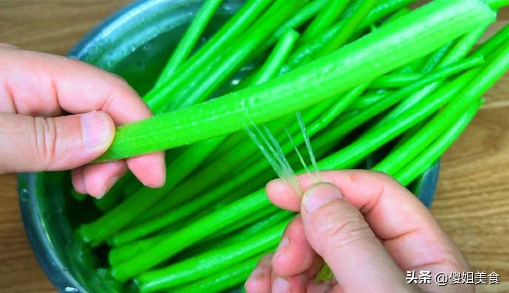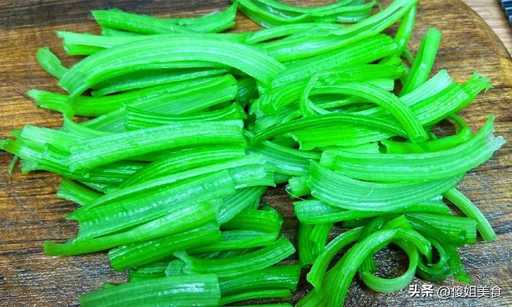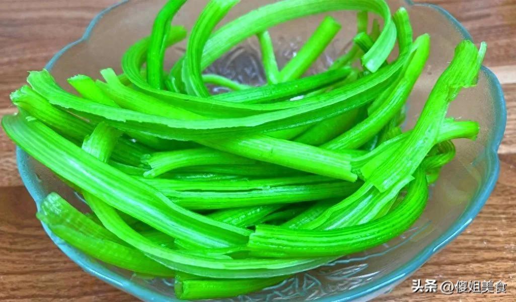 這過程莫名解壓!一根接一根,聽着那悅耳的撕拉聲,看着指尖漸漸染上淡淡的青綠色,心裏異常滿足。不一會兒,處理好的嫩莖便堆成了碧玉小山,瑩潤透亮。