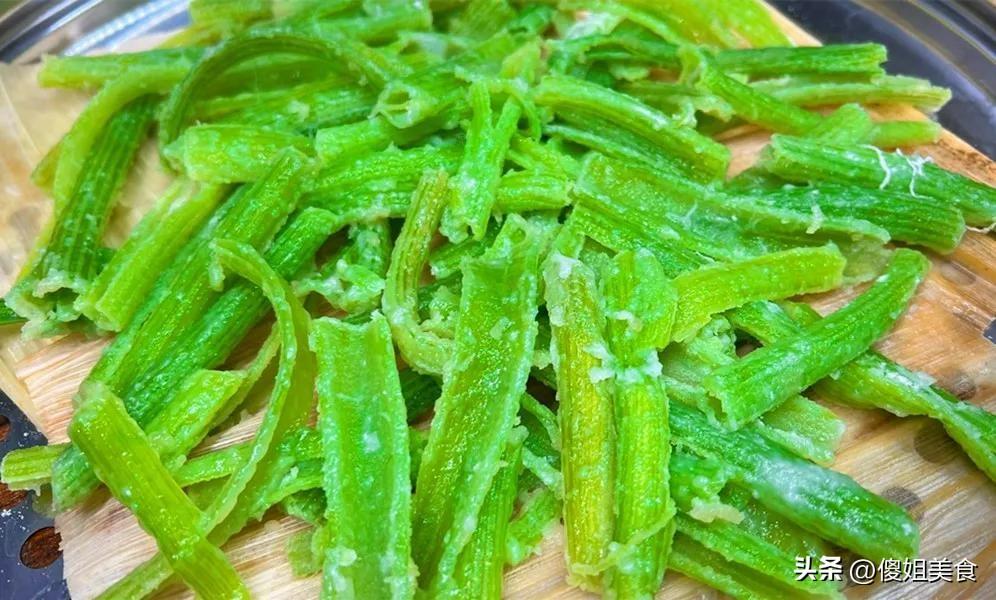 接下來,便是賦予它靈魂的時刻。抓起一把麪粉均勻地、撒在嫩莖上。雙手輕輕抄拌、抖散,讓每一根莖條都薄薄地裹上一層雪白衣裳。麪粉不能貪多,薄薄一層足矣,保留莖稈本身的清爽是精髓。