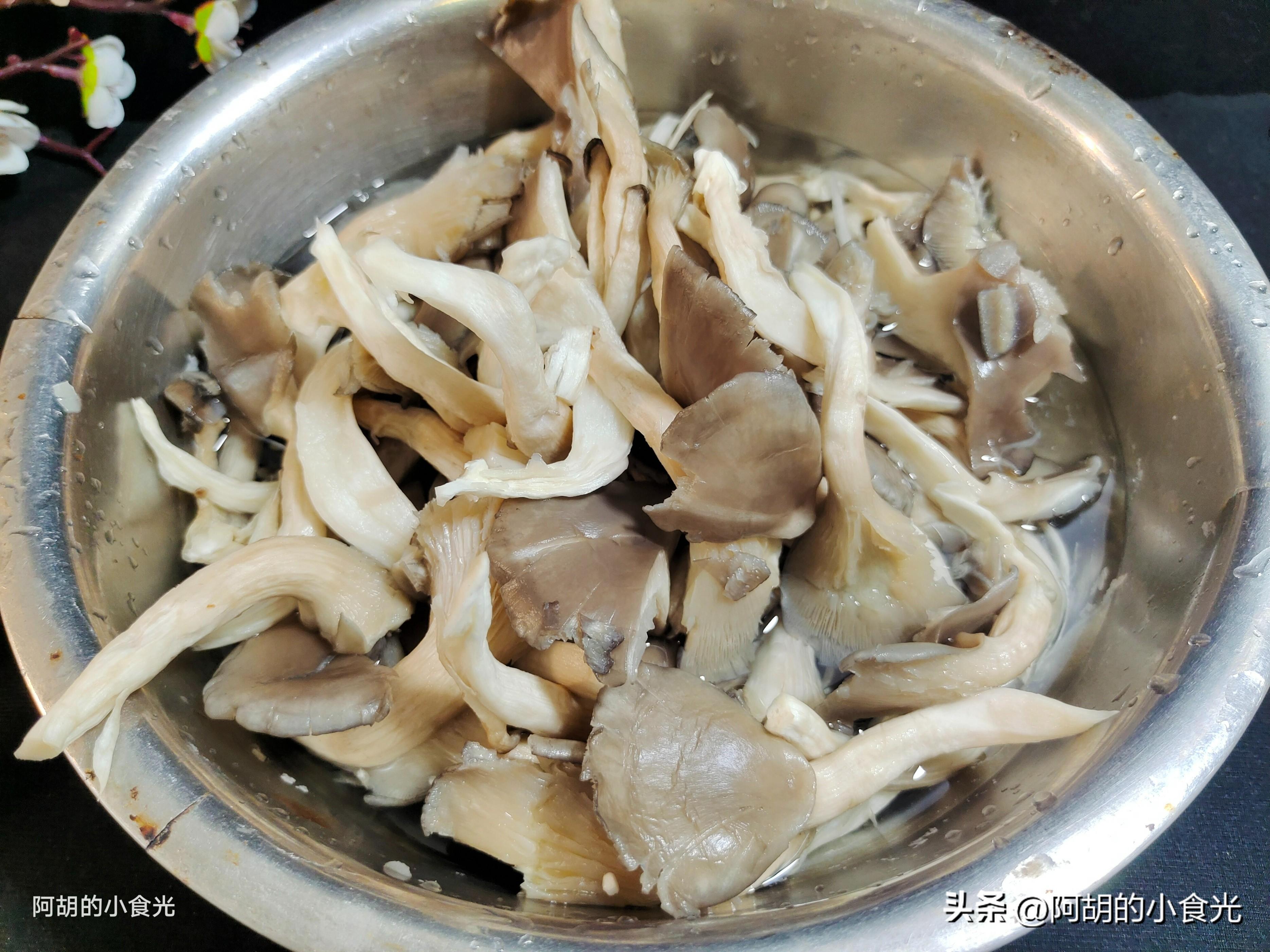 第三步:平菇的土腥味比較大,這裏建議提前進行一下焯燙,只要燒一些開水保持沸騰,將平菇倒入其中,煮個一分鐘就撈出來。撈出的平菇可以用涼水衝一衝,而後稍微擠一擠水分後待用。