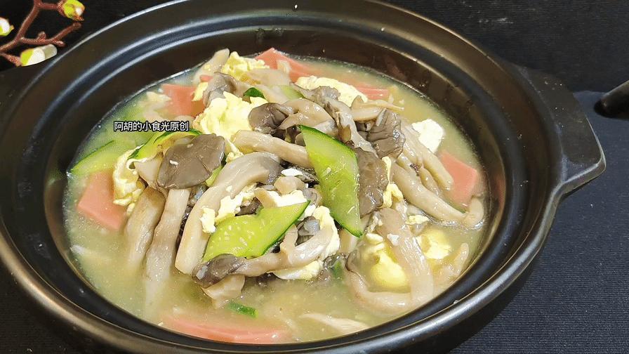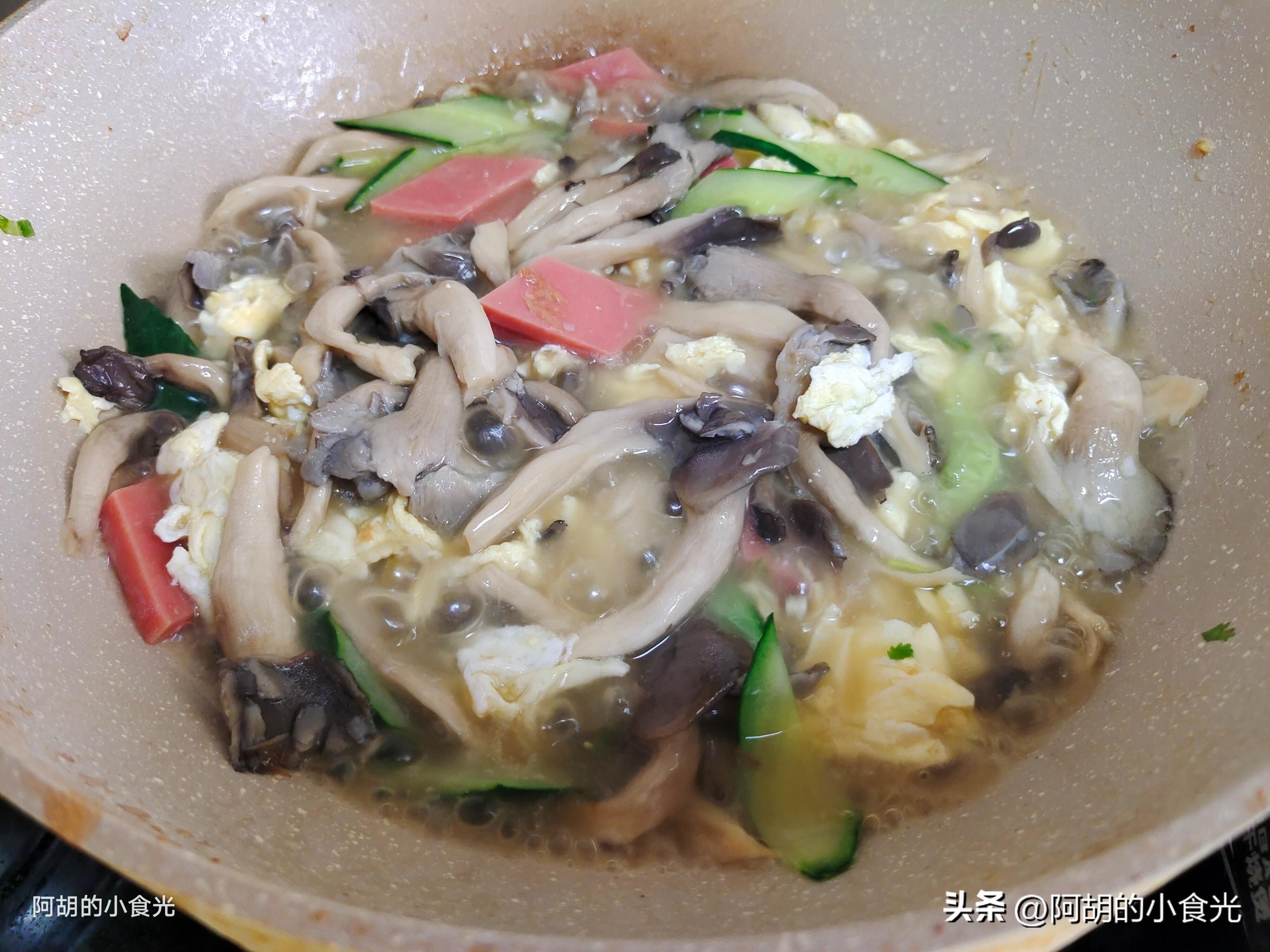 第六步:最後用涼水稀釋一些幹澱粉成澱粉水,攪拌均勻後保持大火淋入鍋中,同時用勺子不停地翻炒,直至湯汁變得濃稠可以掛在食材表面即可出鍋。食材簡單,做法簡單的一道湯菜,脆嫩的平菇,有了鮮香的雞蛋和清香的黃瓜加持,更加開胃下飯,值得各位試一試的做法。