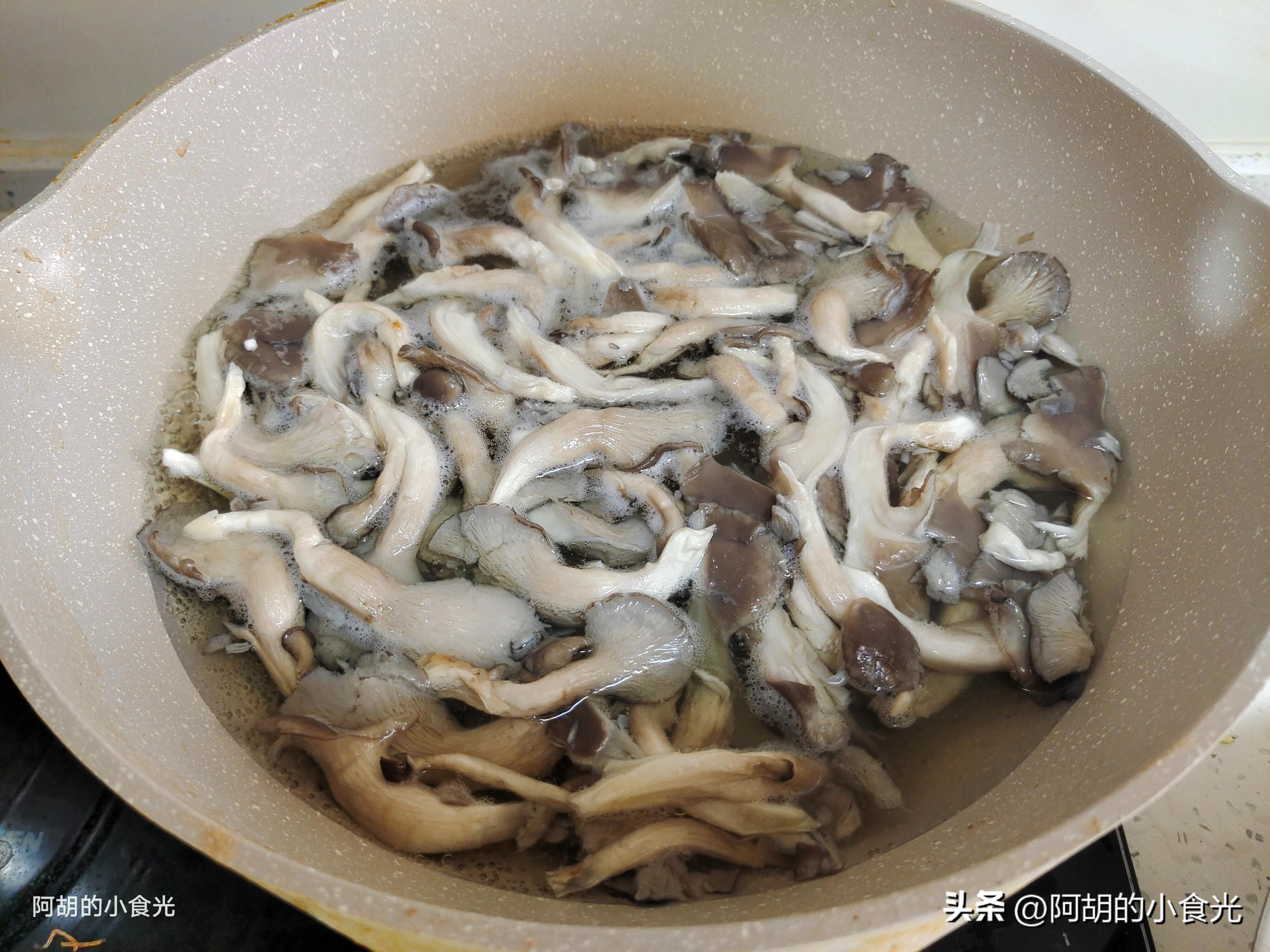 第四步:所有食材準備完畢後就可以開火烹飪。鍋燒乾後淋入一些菜籽油保持小火燒熱,而後加入蔥蒜等一些小料炒出香味,接着將焯水後的平菇倒入鍋中,轉爲最大火開始翻炒,炒出一些水分激發出鮮香味,再淋入少許生抽和適量的蠔油炒勻炒透。