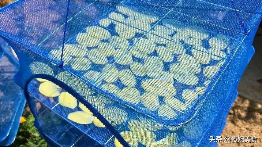 6、曬的過程中,記得每天翻動1-2次。這樣能讓土豆片曬得均勻,正反兩面都能充分脫水,不容易有“陰陽面”或者局部發粘。翻的時候輕一點,畢竟煮過之後土豆片變軟了。