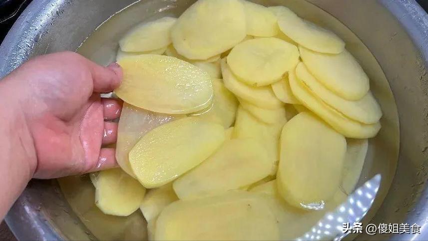 3、別煮透! 這是最關鍵的技巧!煮到土豆片剛剛變得有點透明,邊緣開始有點軟,但用筷子戳一下,中心還是硬挺的、有阻力的狀態,就立刻關火! 千萬千萬別煮全熟了!煮過了,土豆片就粉了軟了,後面一曬就容易碎,口感也面嘟嘟的不好。大概水開後再煮個2-3分鐘,具體看土豆片厚度和火力,一定要盯緊狀態。