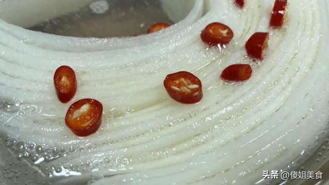 時間一到,迫不及待打開冰箱!那蘿蔔片,吸飽了湯汁,變得晶瑩透亮,紅紅的小米辣點綴其間,看着就口舌生津!夾起一大筷子,蘿蔔片薄如蟬翼,顫顫巍巍,掛着誘人的汁水。