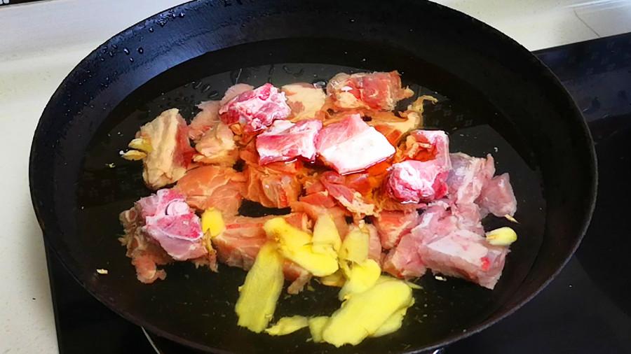 3.起鍋加油,放入冰糖,開最小火,用鏟子不停地翻炒,讓冰糖融化,冰糖會從塊狀變成液態,接着顏色逐漸加深,從淺黃到深黃再到淺棕,當糖液變成深棕紅色,並冒出密集的小泡,同時聞到明顯的焦糖香氣時,立即倒入瀝乾水分的排骨,轉中火快速翻炒,讓排骨均勻裹上糖色,然後再加入熱水。