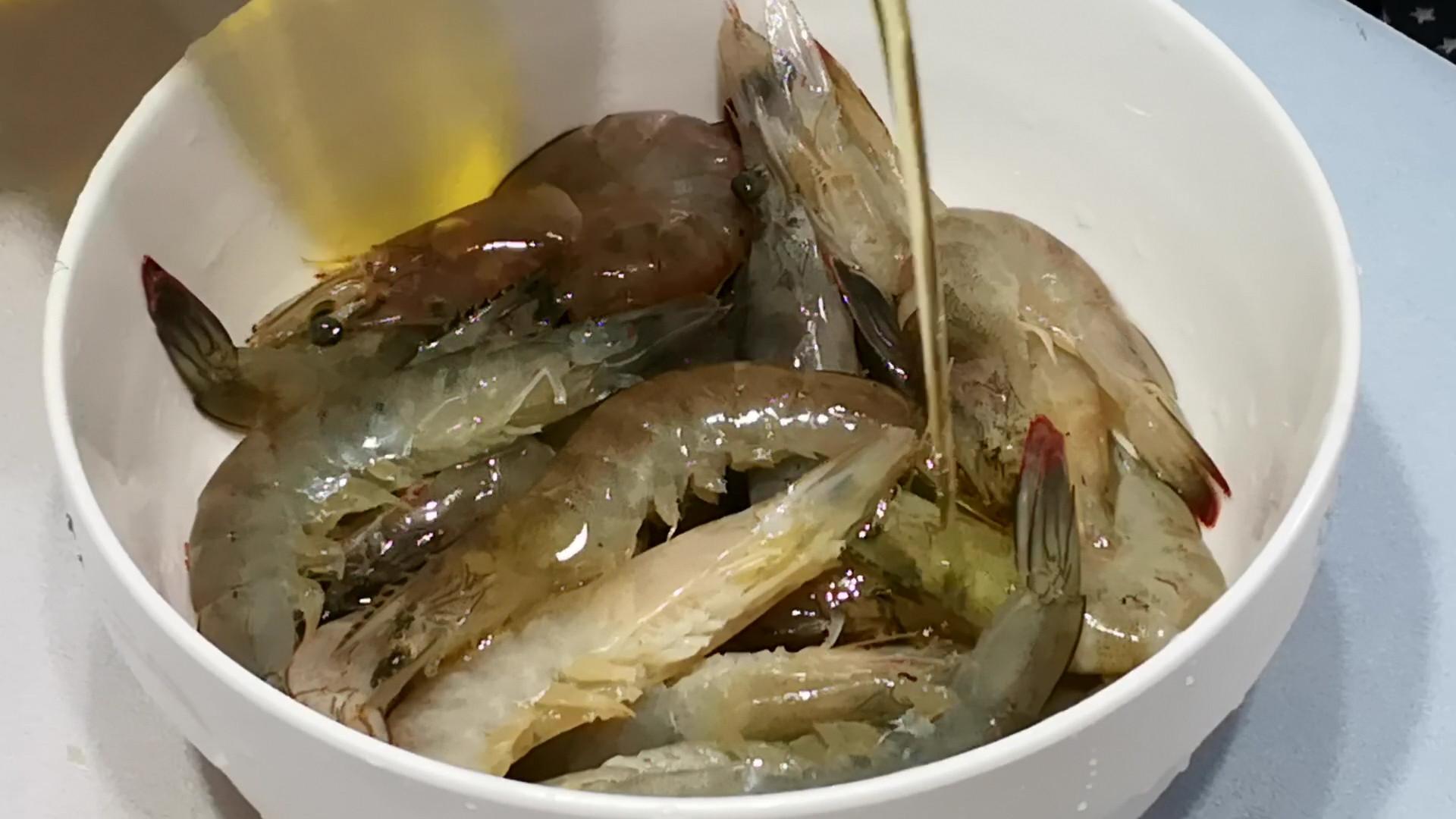 接着用清水多衝洗幾遍,洗淨後的大蝦放入淡鹽水中浸泡5分鐘,然後控幹水分放到大碗裏,滴入適量食用油,下手輕輕抓拌均勻,讓每個大蝦的表面都均勻地裹滿油。這樣可以鎖住大蝦的營養和水分,營養不流失,而且,煮好的蝦也會更鮮嫩。