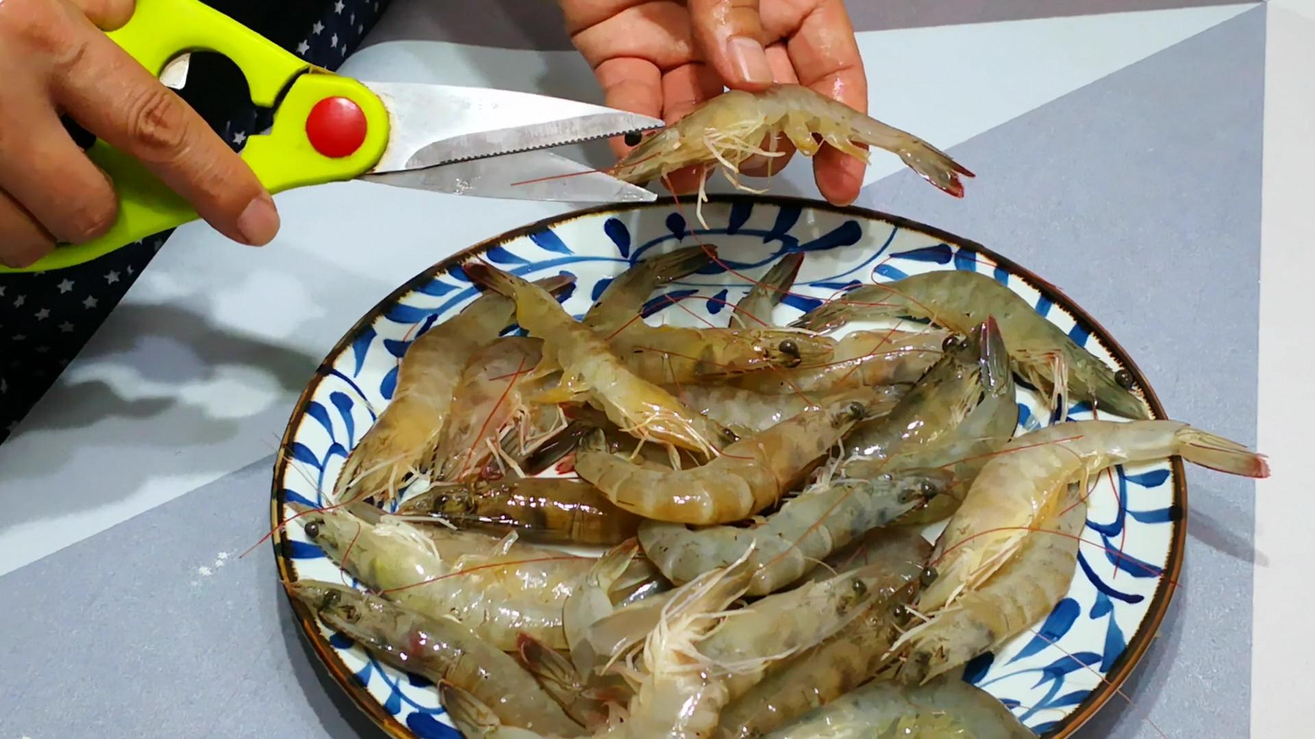 首先,處理大蝦有講究,買回來的大蝦,先剪去蝦鬚和蝦槍,用牙籤從蝦背第二節處挑出蝦線,這是腥味的主要來源,蝦線不挑出來,喫起來也會覺很牙磣。