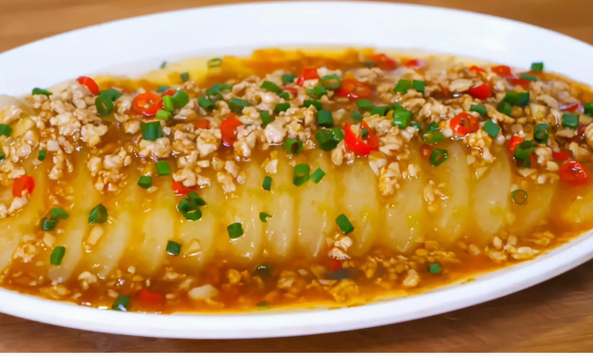 4、冬瓜已經蒸好了,取出把蒸汽水倒掉,澆上肉末湯汁,最後撒蔥花就做好了。