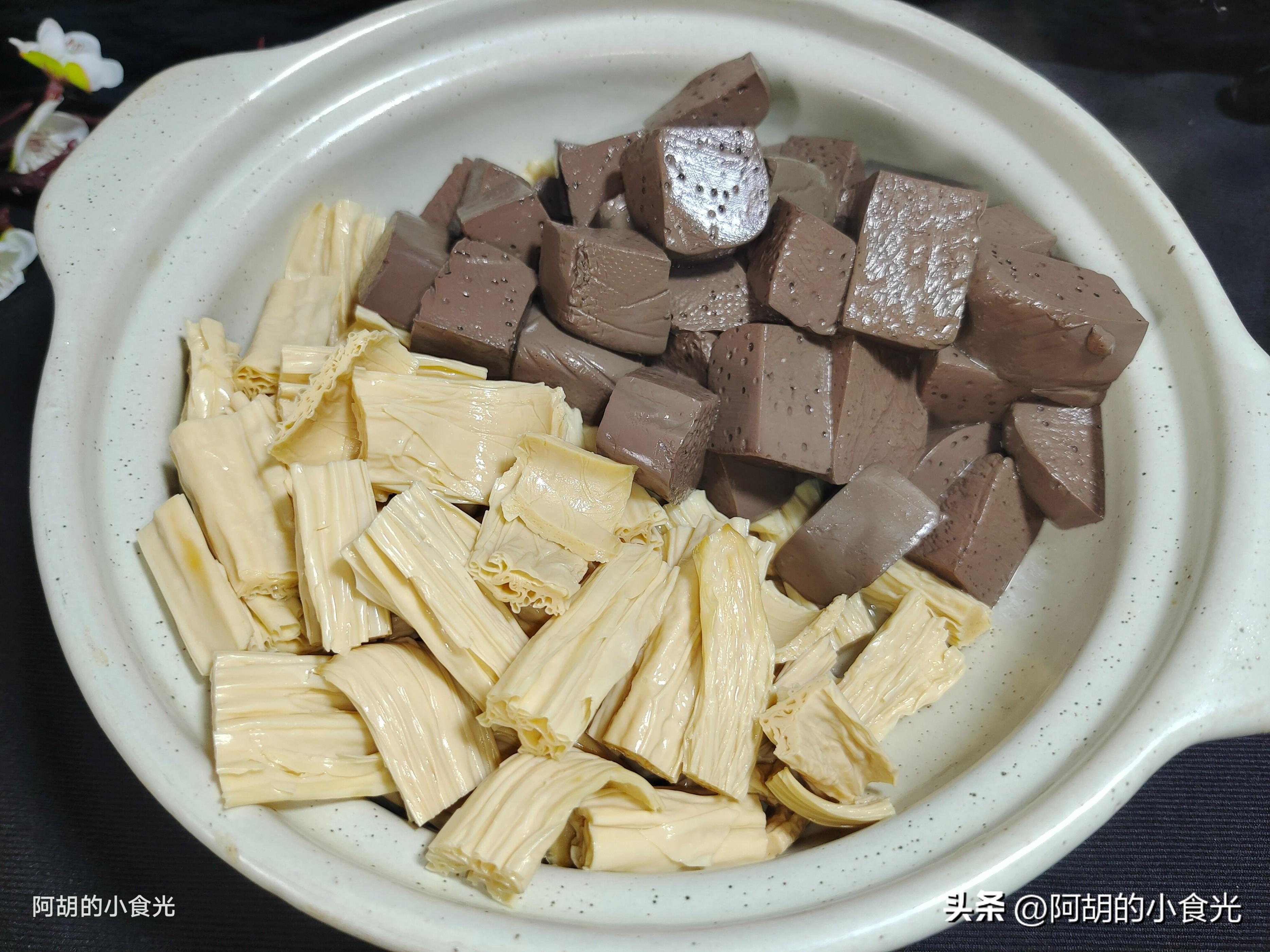 第一步:先準備一把幹腐竹,折斷後放入涼水中浸泡3個小時以上,充分地泡軟沒有硬芯後撈出擠幹水分,再切開成小段放入碗中備用。順便準備一塊豬血,切成小塊後放入開水鍋中進行焯燙,水開後煮個5分鐘就撈出,置於一邊瀝乾水分待用。