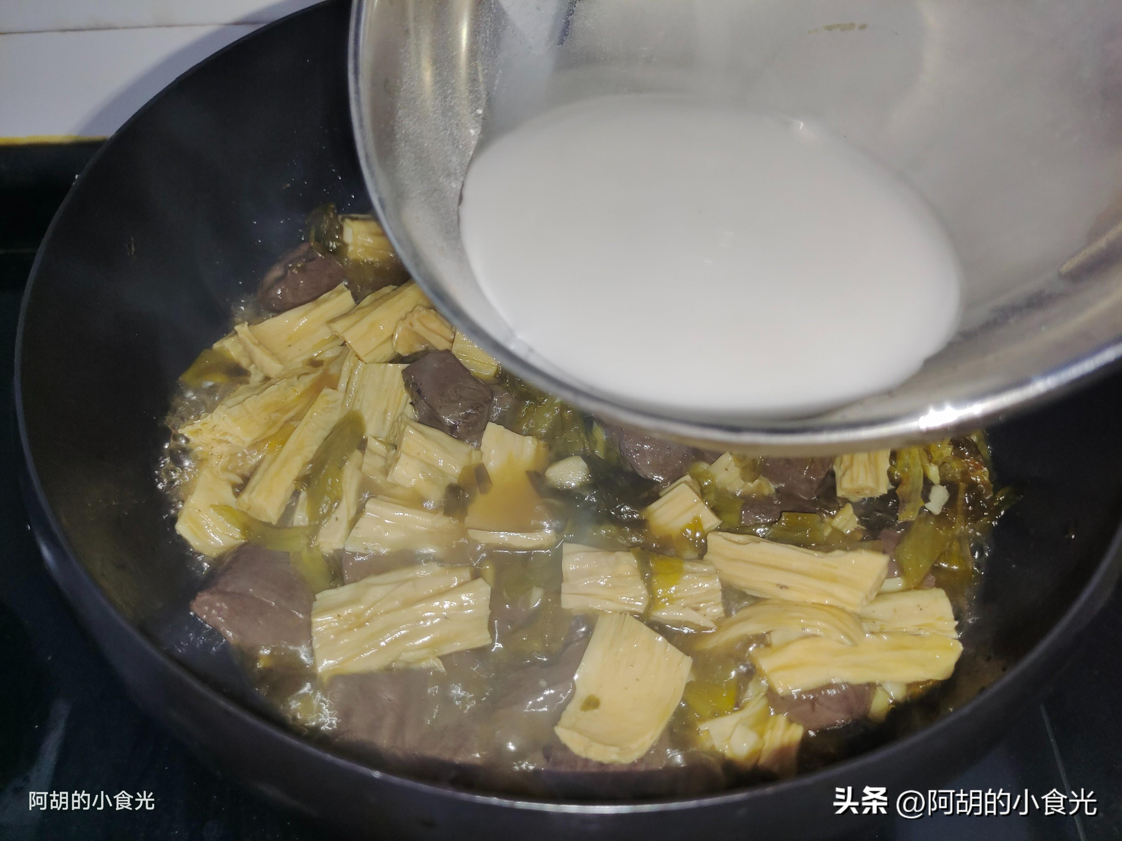 第五步:時間到後用涼水稀釋一些幹澱粉,攪拌均勻後淋入鍋中,同時鍋內要保持大火併用勺子翻拌,讓澱粉水和湯汁融合後充分地糊化開來,最終使湯汁濃稠起來即可。最後取出韭菜段倒入鍋中,簡單翻拌幾下就可以關火出鍋了。簡單好做的一道菜,腐竹和豬血都是極致的軟嫩入味,酸香開胃,妥妥的下飯好菜,感興趣的一定要試一試今天這個做法。