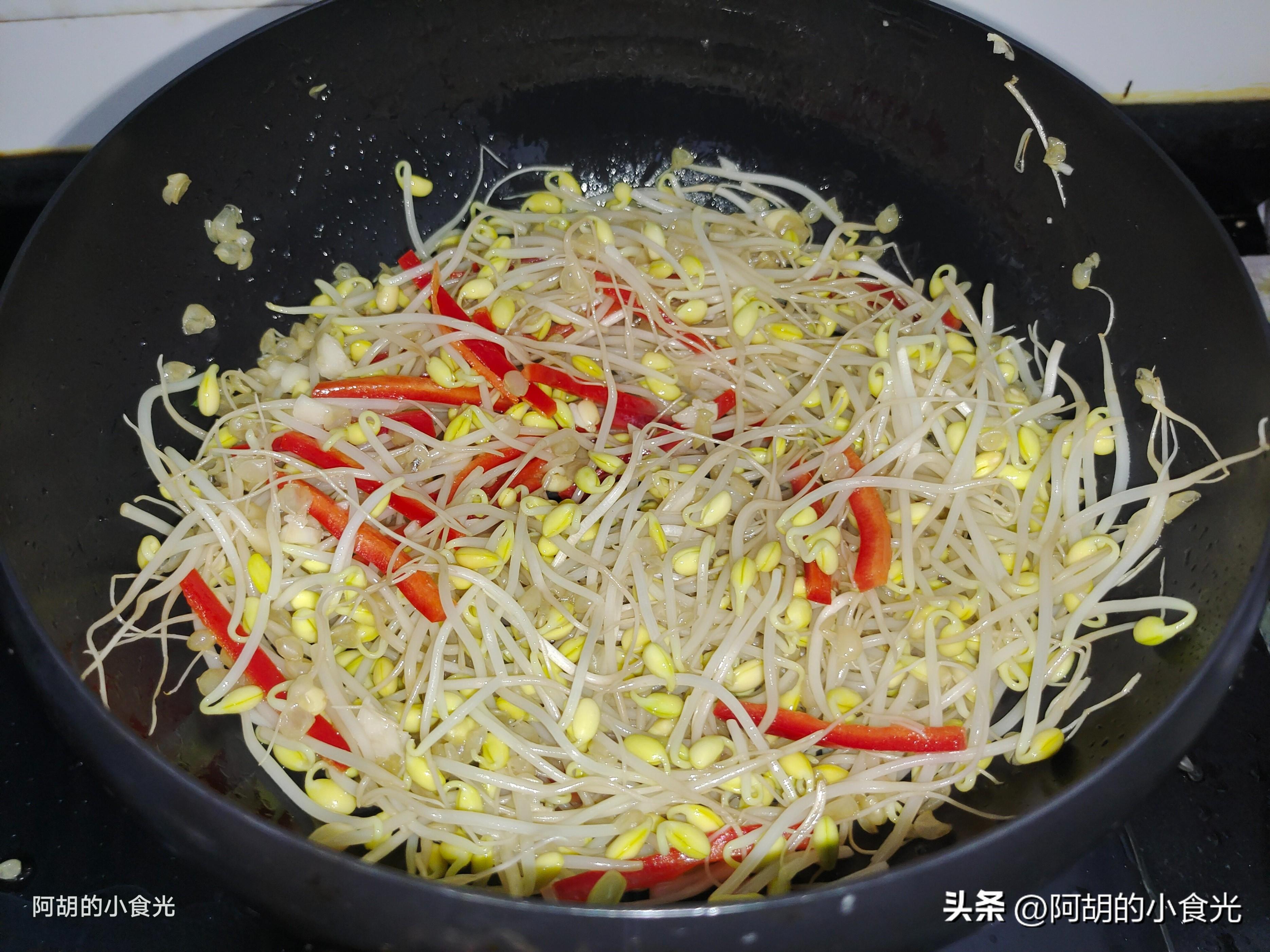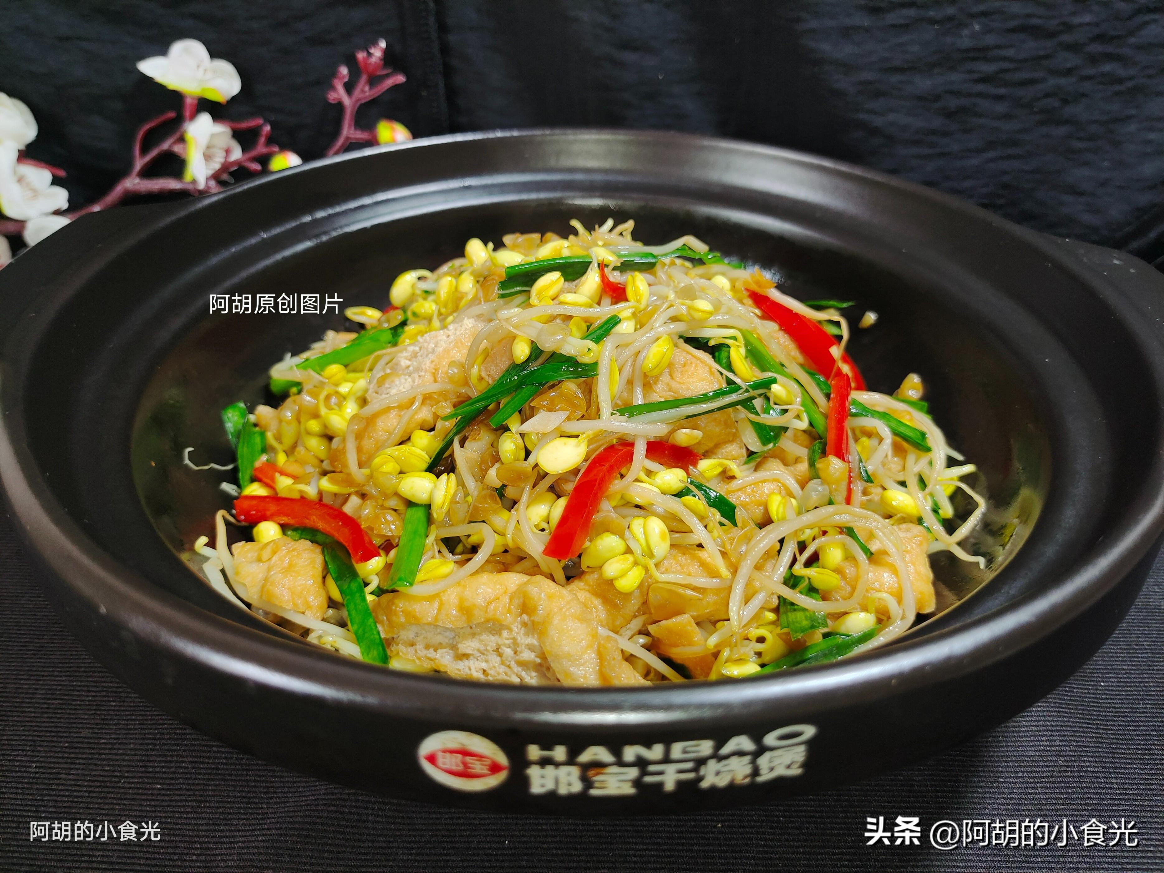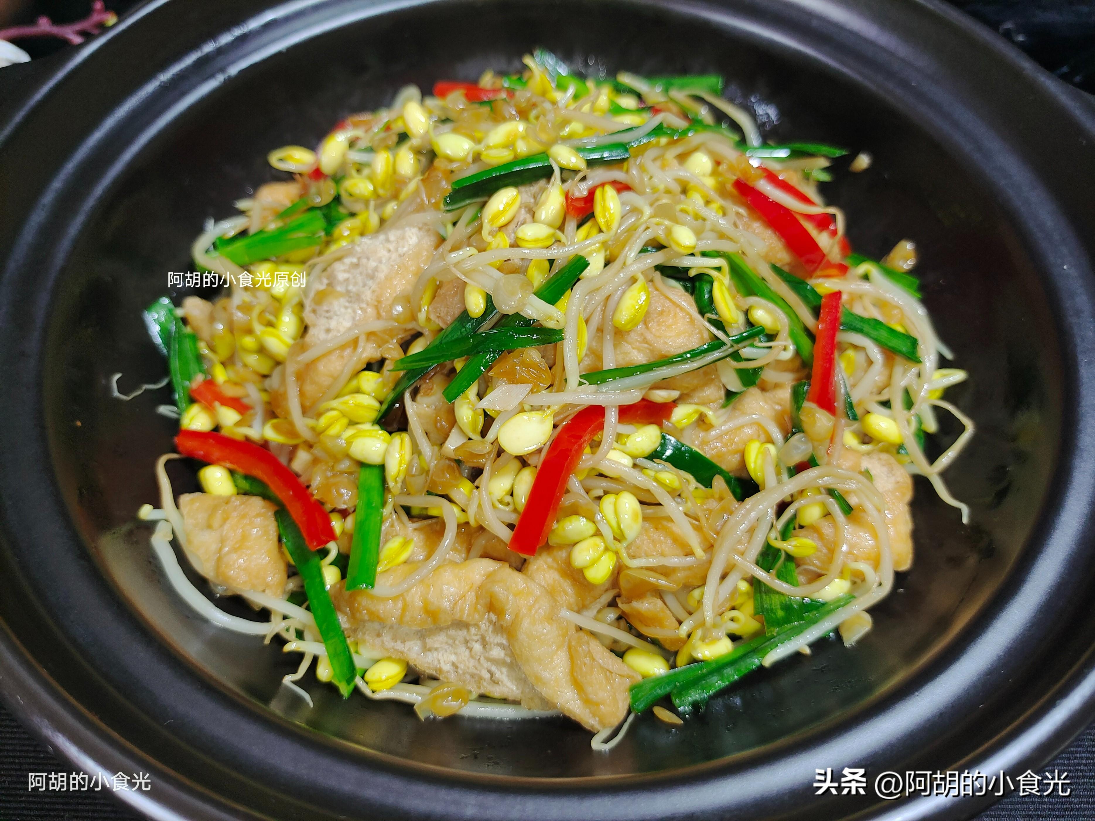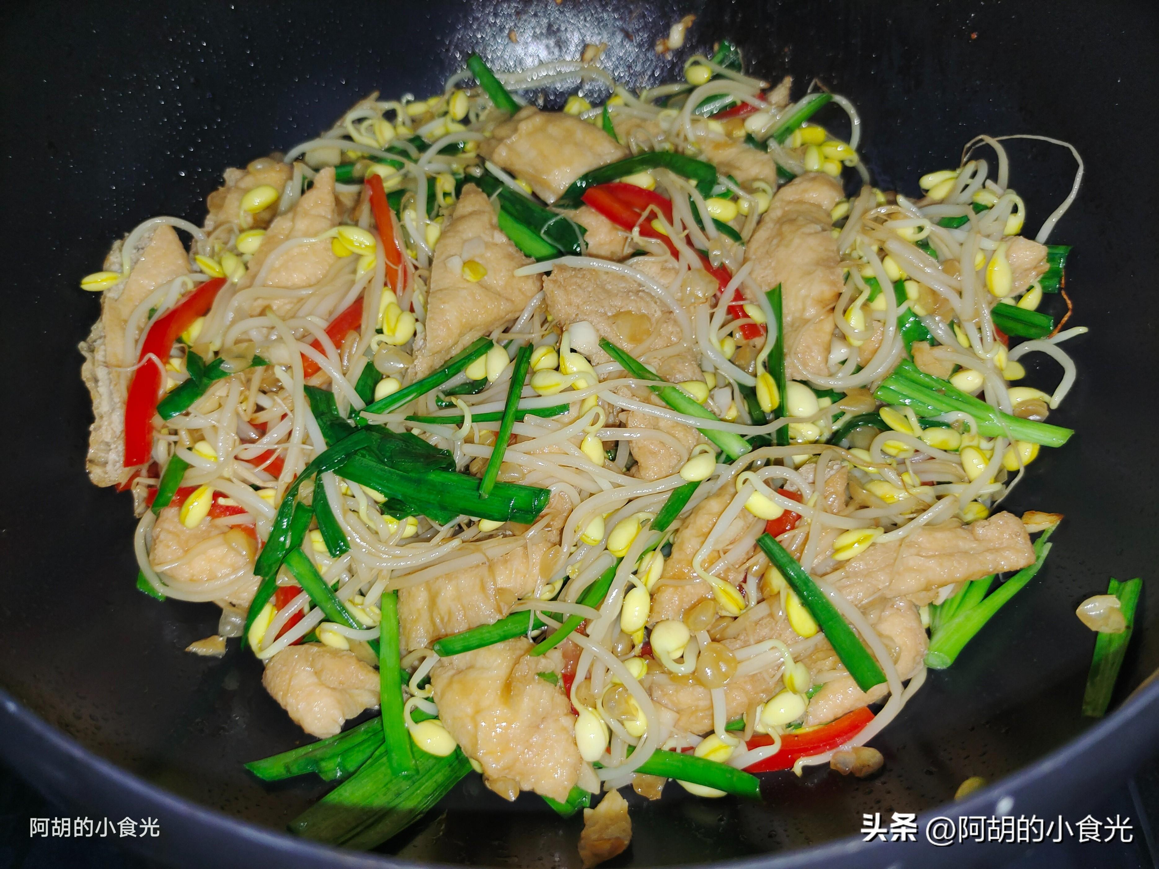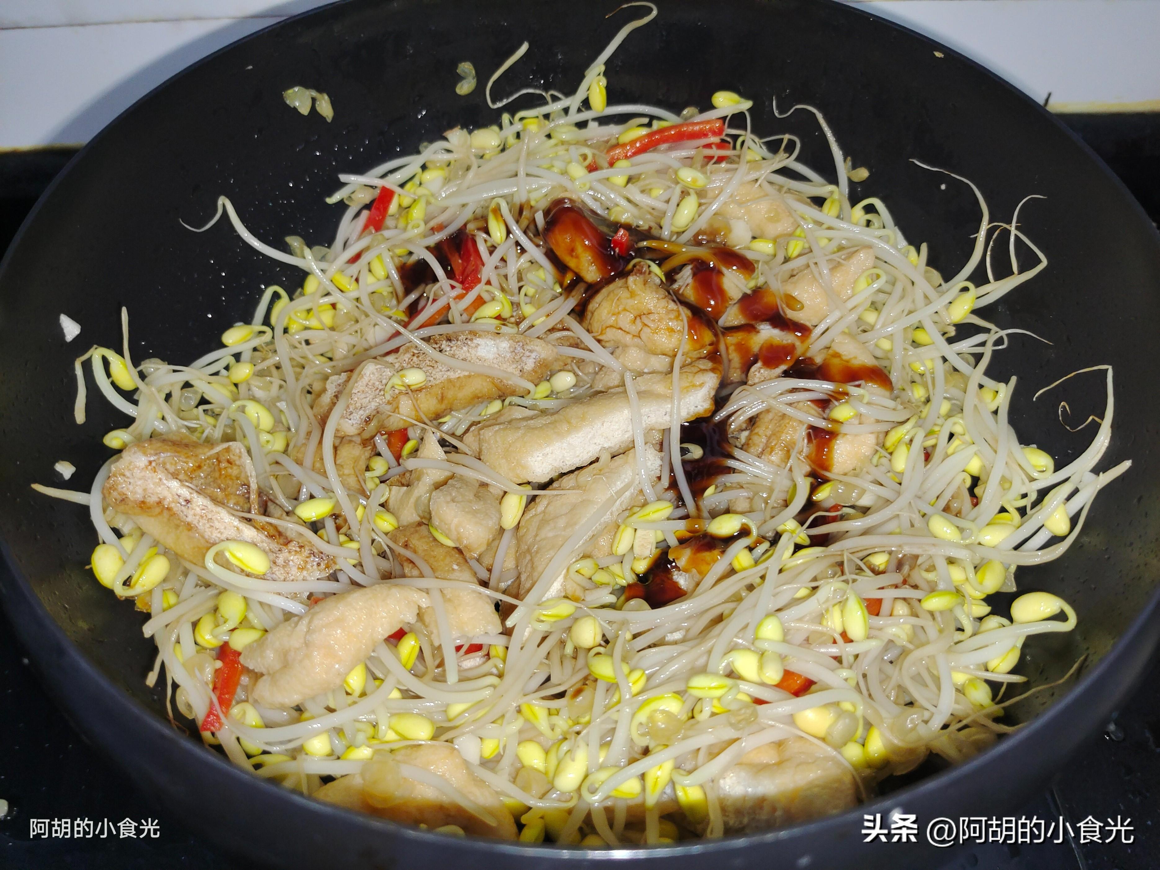 此道菜是大火快炒的“無湯”菜,大火快炒是關鍵,但是食材的處理也要注意,比如豆芽這個食材,清洗後儘量瀝乾水分,避免帶有大量的水分下鍋,還有油豆腐,焯水後也要擠一擠水分,水分太多,容易讓道菜“水嘰嘰”的,失去了一些幹香味。