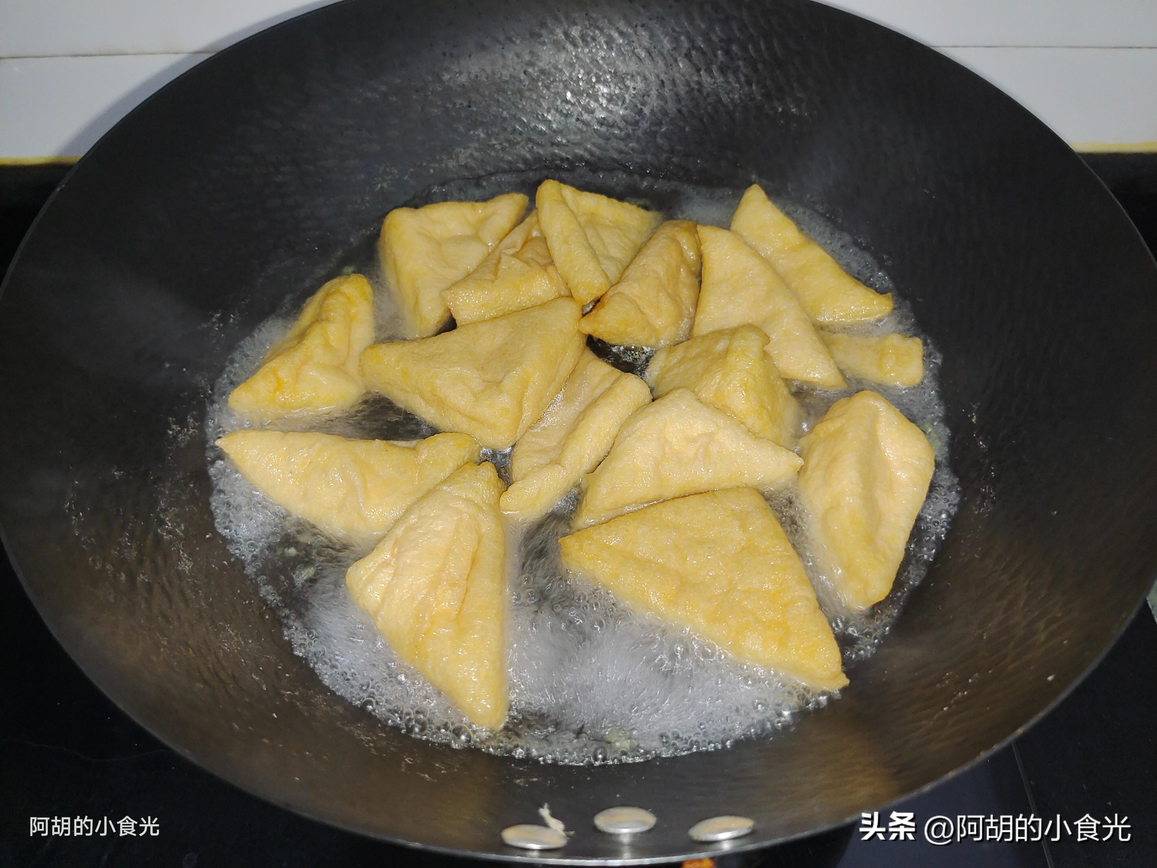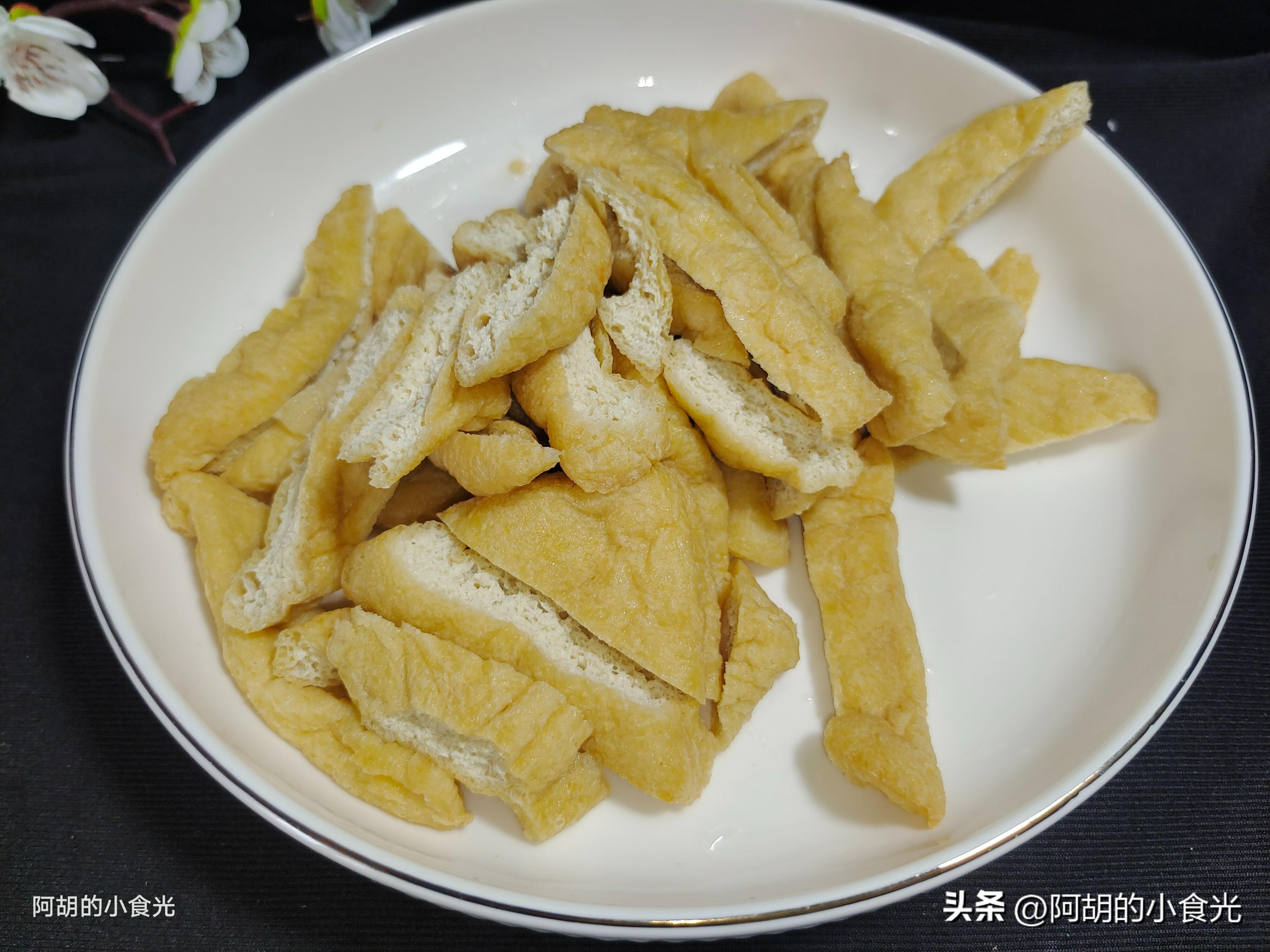 第二步:另一個主要的食材就是油豆腐。我們可以先將油豆腐下入開水鍋中燙個一兩分鐘,可以幫助去除一些多餘的油脂,也可以讓油豆腐變軟,方便炒的時候入味。撈出後用涼水衝一衝使其降溫,而後擠一擠水分,再將其切開後備用。