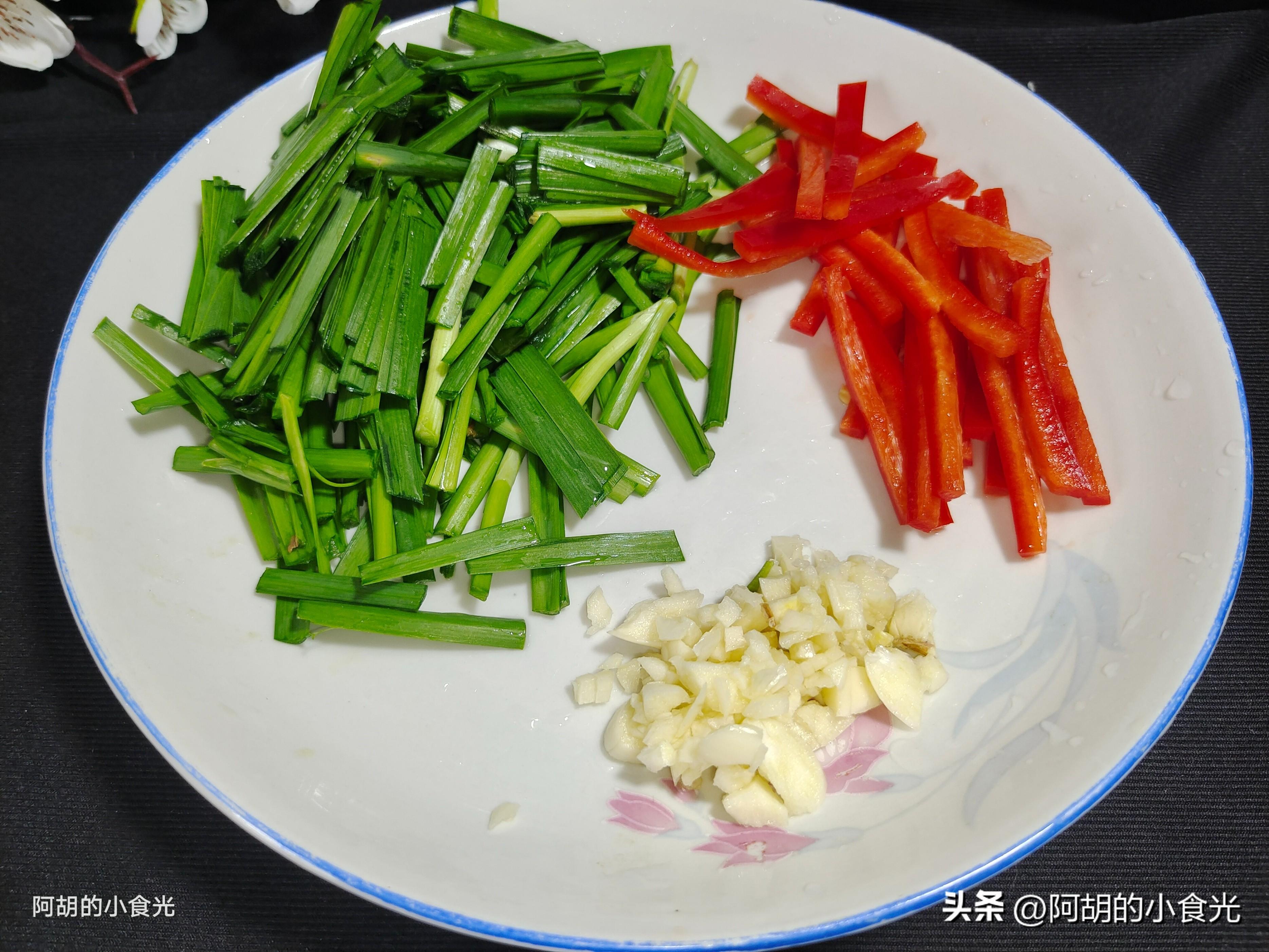 第一步:先來準備各種食材,最主要的就是黃豆芽了,用清水淘洗幾遍,將一些豆皮全部打撈乾淨,豆芽撈出後置於一邊瀝乾水分待用。同樣的你也可以用綠豆芽來搭配。還有一些配菜有韭菜一小把洗淨後切段備用,半個紅椒切絲用來配色,喜歡辣味的可以用紅小米椒代替。還有適量的大蒜末作爲小料使用。