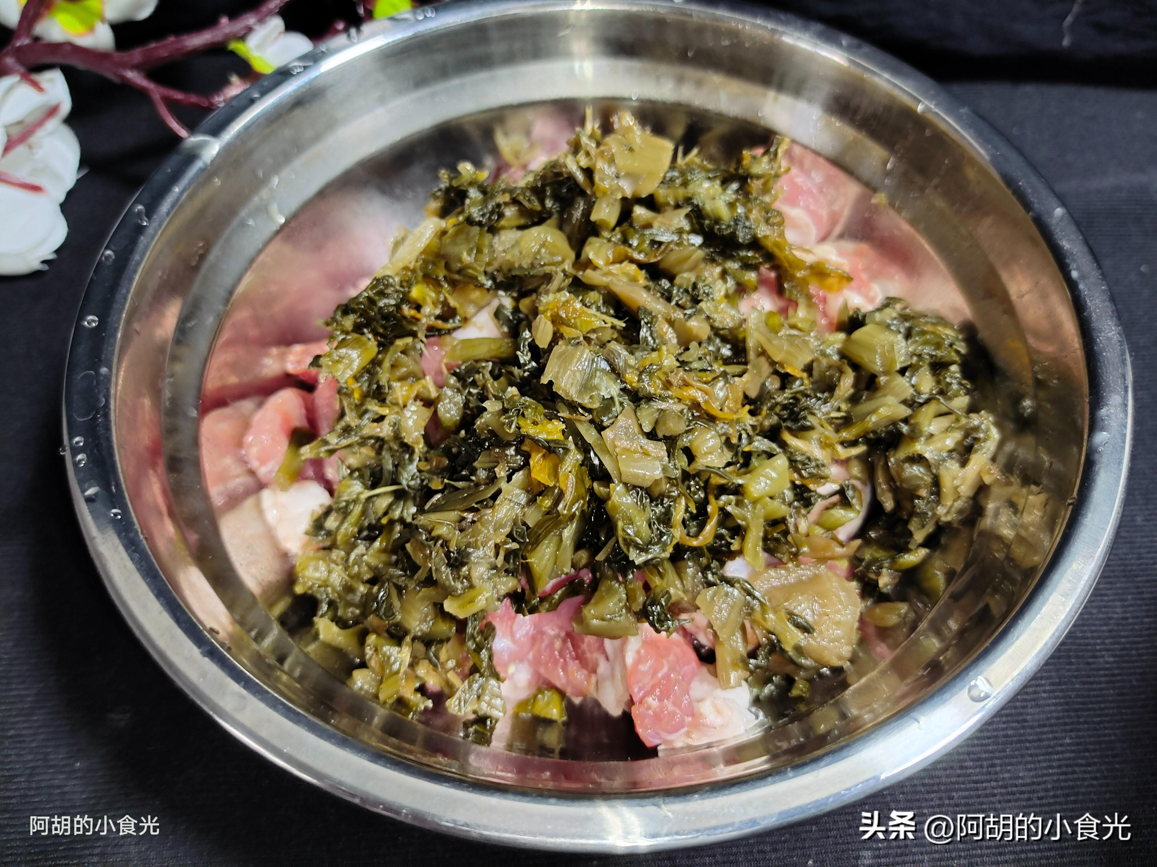 第四步:再來準備今天的梅頭肉。所謂的梅頭肉就是豬的肩胛肉部位,瘦肉中含有一些脂肪紋理,喫起來比較嫩。無論是炒、蒸、還是煮湯都可以直接下鍋,無需上漿處理。此處我們直接將瘦肉部位切成片放入碗中,淋入少許生抽和蠔油抓勻,雪菜含有鹽分就不加鹽了。再將雪菜倒入其中,淋入一些花生油多多地抓拌一下,置於一邊醃製十分鐘左右。