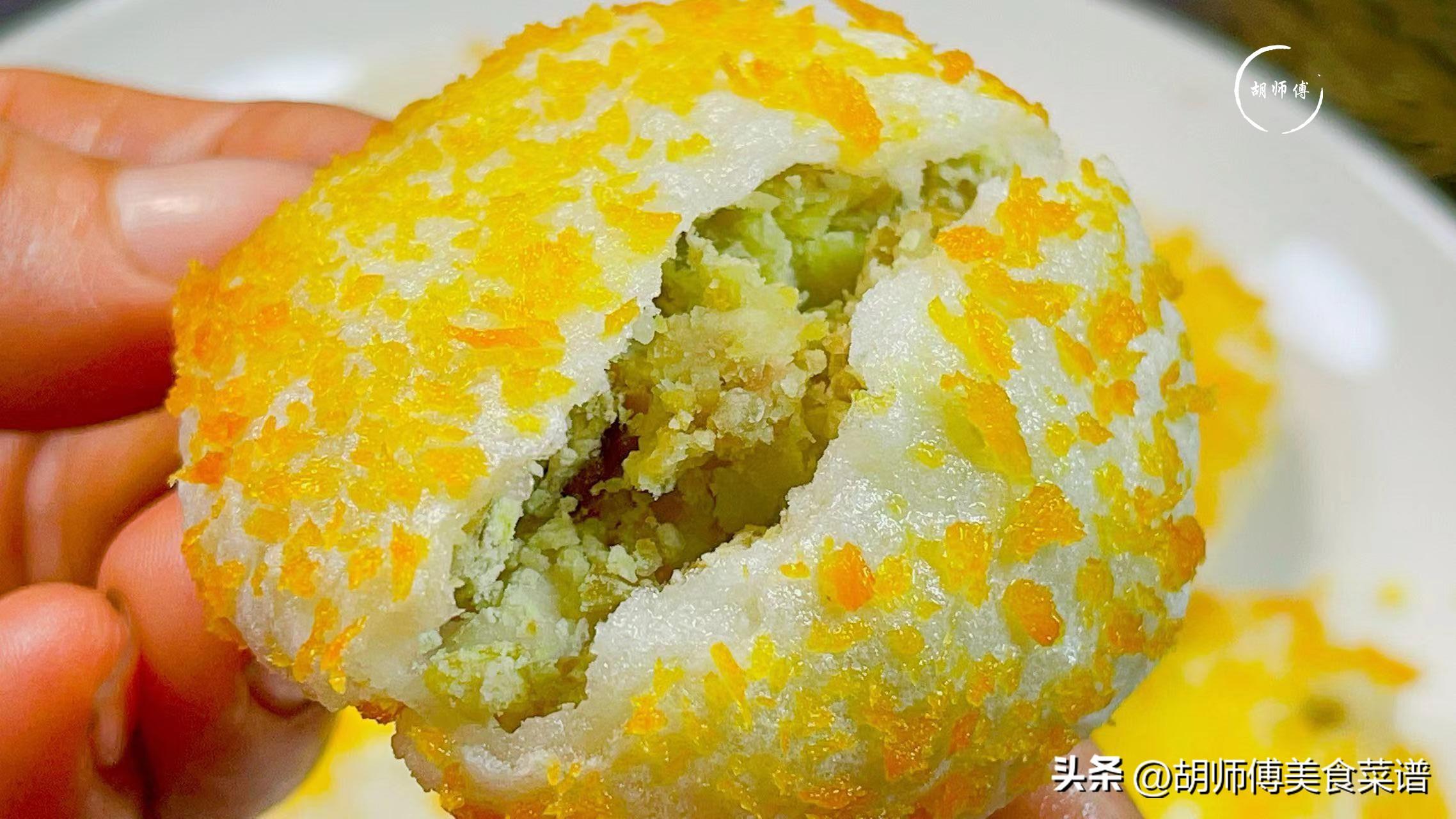 第四步:將板栗餡放入麪皮中包好,然後再次按壓成餅,接着再把餅放入麪包糠中,使餅的每一面都裹上一層薄薄的麪包糠即可。