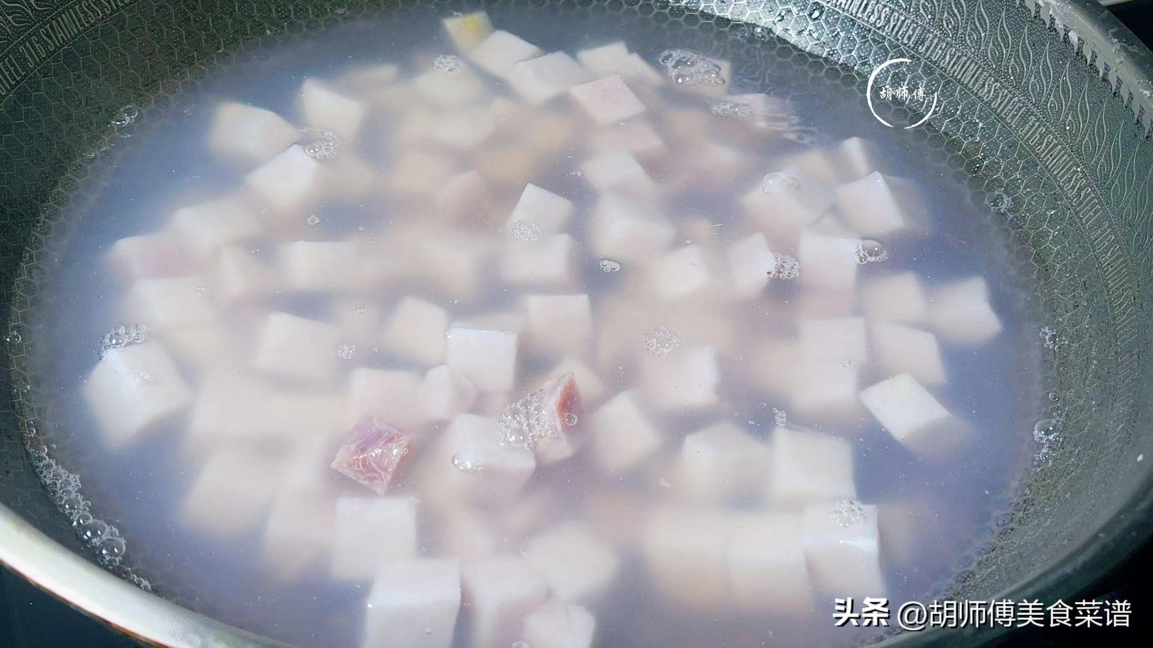 第二步:將香芋削皮後洗淨,然後將香芋切成2釐米左右的正方形,然後將香芋和適量水倒入鍋中,大火將香芋煮10分鐘左右,直到將山藥煮爛。