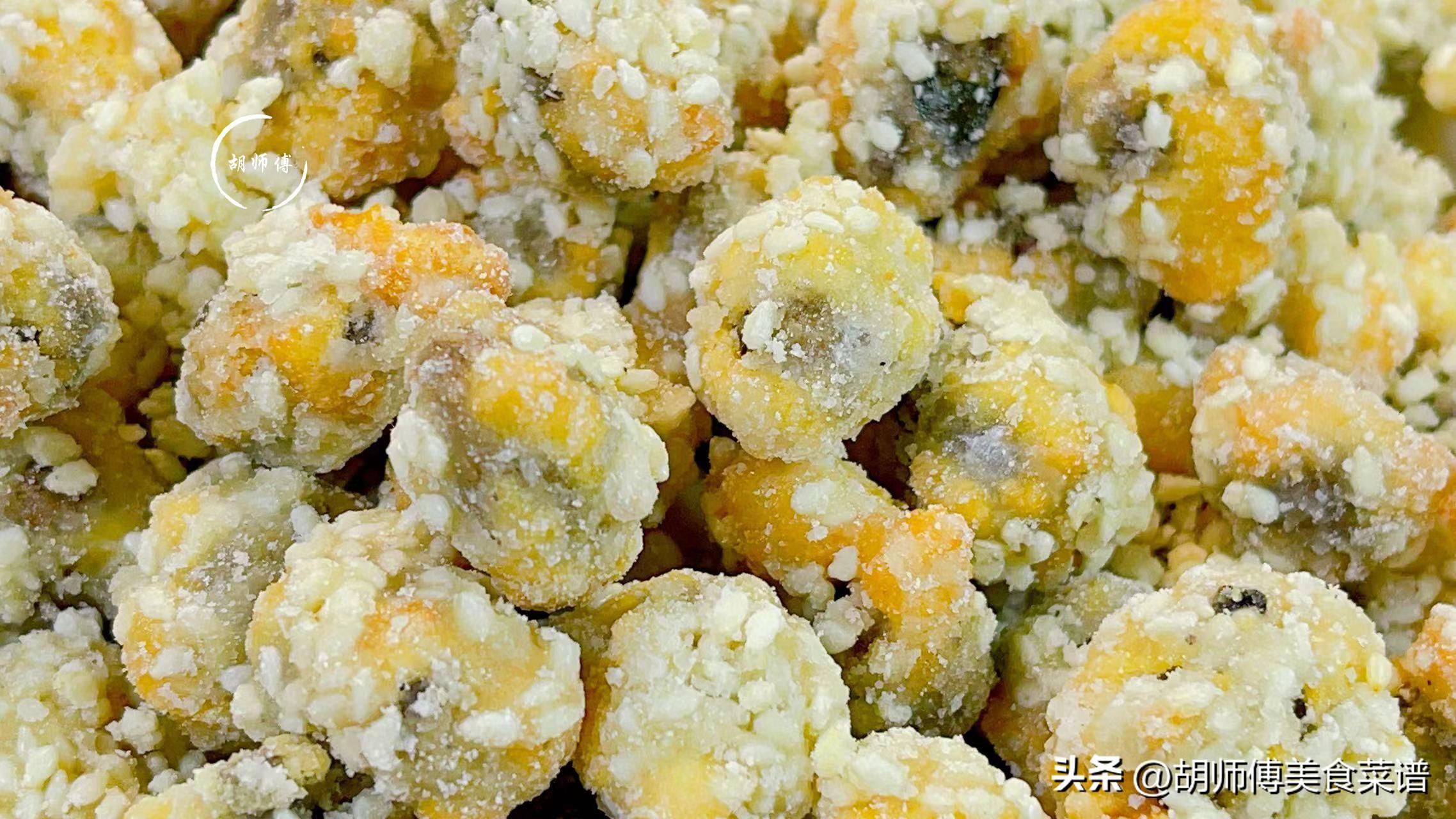【食材準備】:山藥豆250克、雞蛋1個、澱粉50克、麪粉50克、冰糖100克、白芝麻適量。