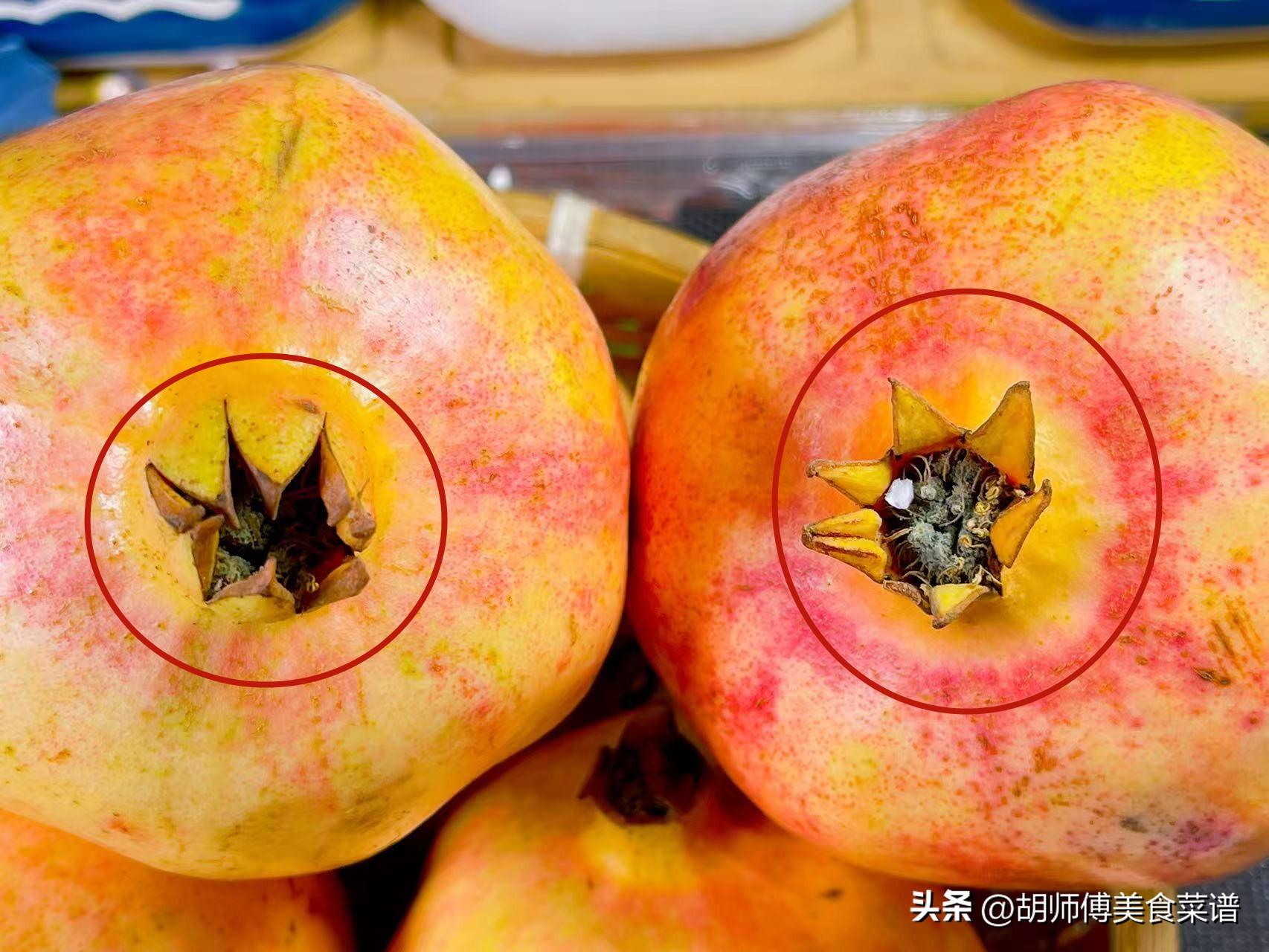 石榴的蒂分爲2種,一種是蒂長開了,還有一種蒂沒有長開,買的時候,我們要買蒂是長開的。因爲隨着石榴的生長時間越來越成長,它底部的蒂像花一樣會慢慢的綻放開,這種蒂長開的石榴,它的成熟度特別高,喫着會比蒂沒有長開的石榴甜1倍。