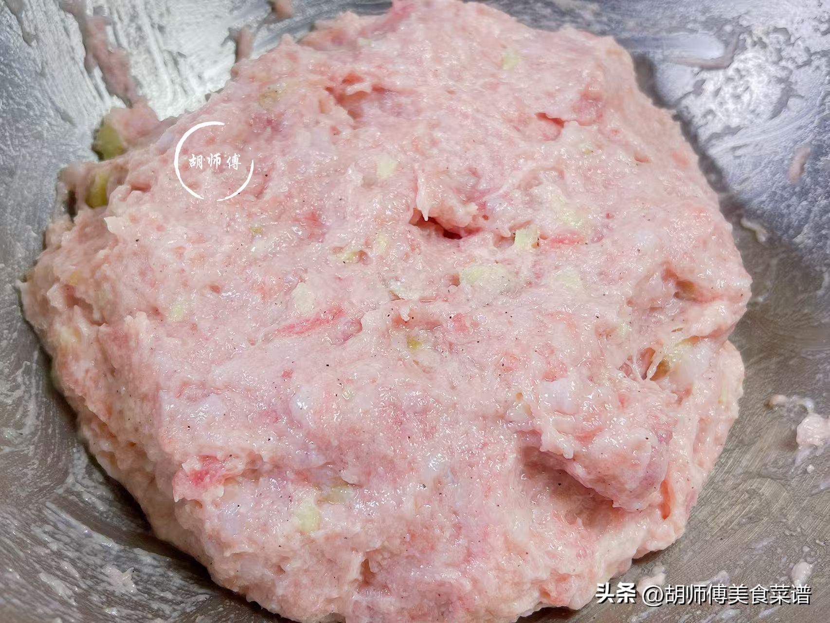 第二步:將前夾肉沖洗乾淨,然後把它剁成肉末,接着再將雞蛋1個、麪粉、蔥花、胡椒粉、食鹽全部都放入盆中,然後快速攪拌3-5分鐘,直到感覺肉非常有勁道,就代表肉攪拌好了,如果肉不攪拌好,肉丸喫着就不會很蓬鬆。