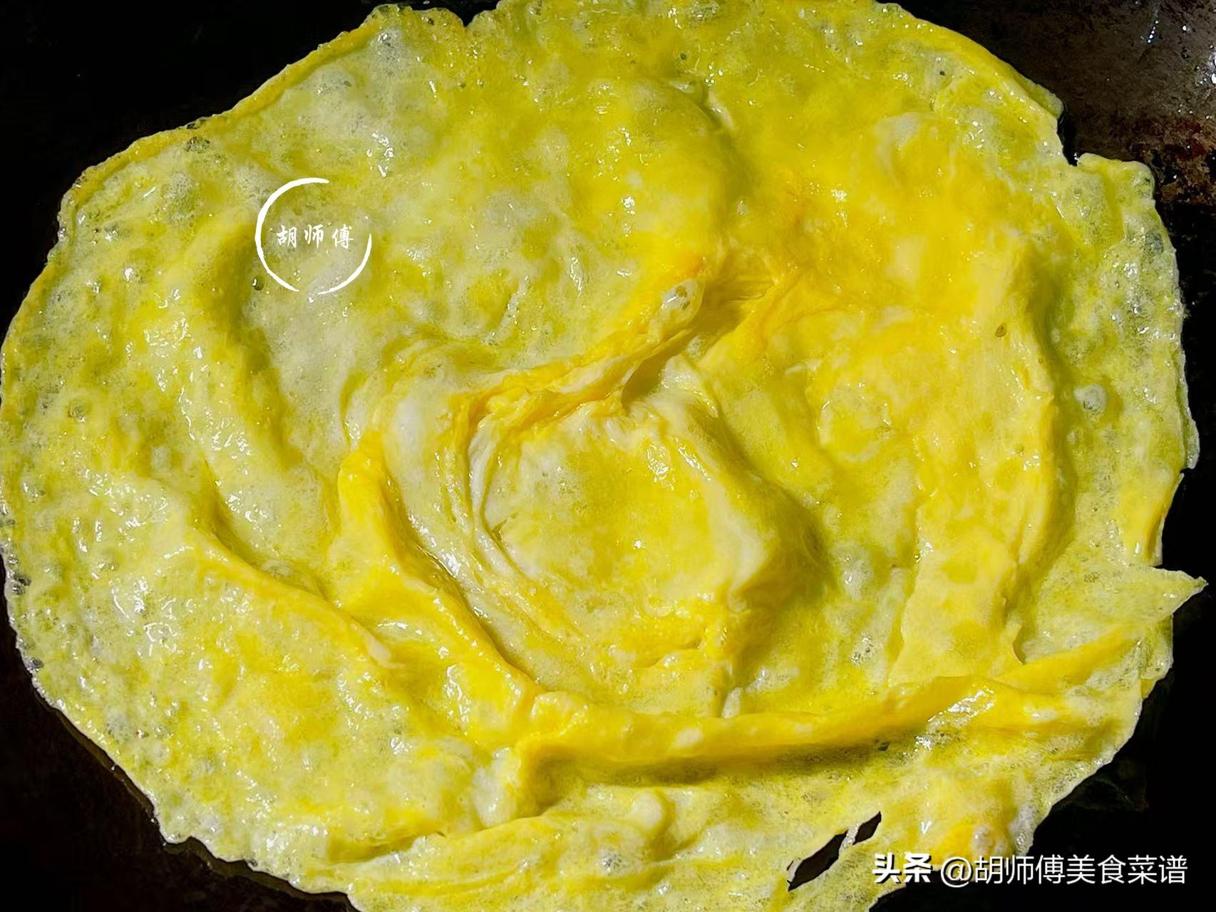第四步:將雞蛋液攪拌均勻,然後鍋中放入油,等油燒熱後,把油倒出來,然後改小火後,再將蛋液放入鍋中攤成雞蛋皮,接着再把攤好的雞蛋皮切成2釐米左右的細絲備用。
